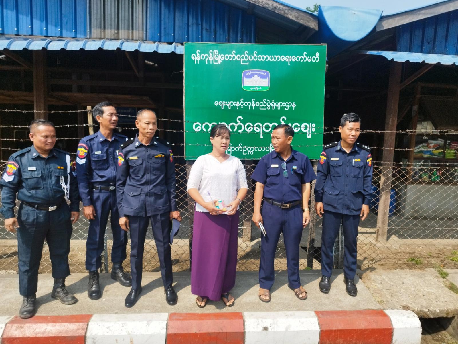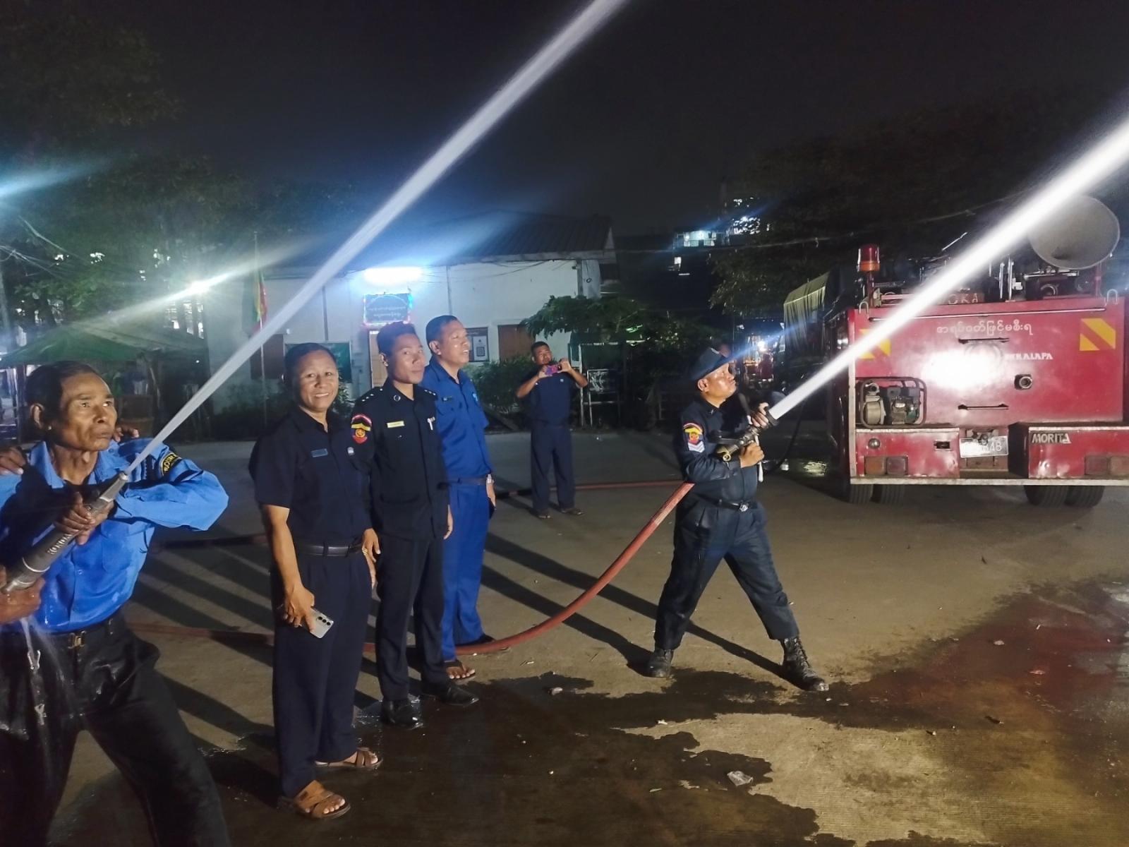 ထို့နောက် မြို့နယ်အတွင်းရှိ ဇီဇဝါ ၁ လမ်း၊ (၂)ရပ်ကွက်ရှိ အမှတ် ၂ စျေးအား မြို့နယ်မီးသတ်ဦးစီးမှူး ဦးစည်သူမျိုးဦဆောင်၍ တပ်ဖွဲ့၀င်များ၊ စျေးဌာနစုမှူးဦးထင်ကျော်၊ စျေးတာဝန်ခံ၊ စျေးညလုံခြုံရေးများပူးပေါင်း၍ ညနေစျေးပိတ်ချိန် ဆိုင်ခန်းများရှိ Breaker များချထားခြင်းရှိ/မရှိ၊ စျေးရေလှောင်ကန်ရေရှိ/မရှိနှင့် စျေးညလုံခြုံရေးများ စျေးအတွင်း မီးငြှိမ်းသတ်ရန်စီမံဆောင်ရွက်ထားသည့် အပေါ့စားစက်အား အသုံးပြုတတ်ခြင်း ရှိ/မရှိ၊ ပိုက်ခေါင်းနော်ဇယ်အား ကိုင်တွယ်အသုံးပြုပုံတို့အား မီးငြှိမ်းသတ်ယာဉ် ၁ စီးဖြင့် စစ်ဆေးလေ့ကျင့်ပေးခဲ့ခြင်းများ ဆောင်ရွက်လျက်ရှိကြောင်း သိရသည်။