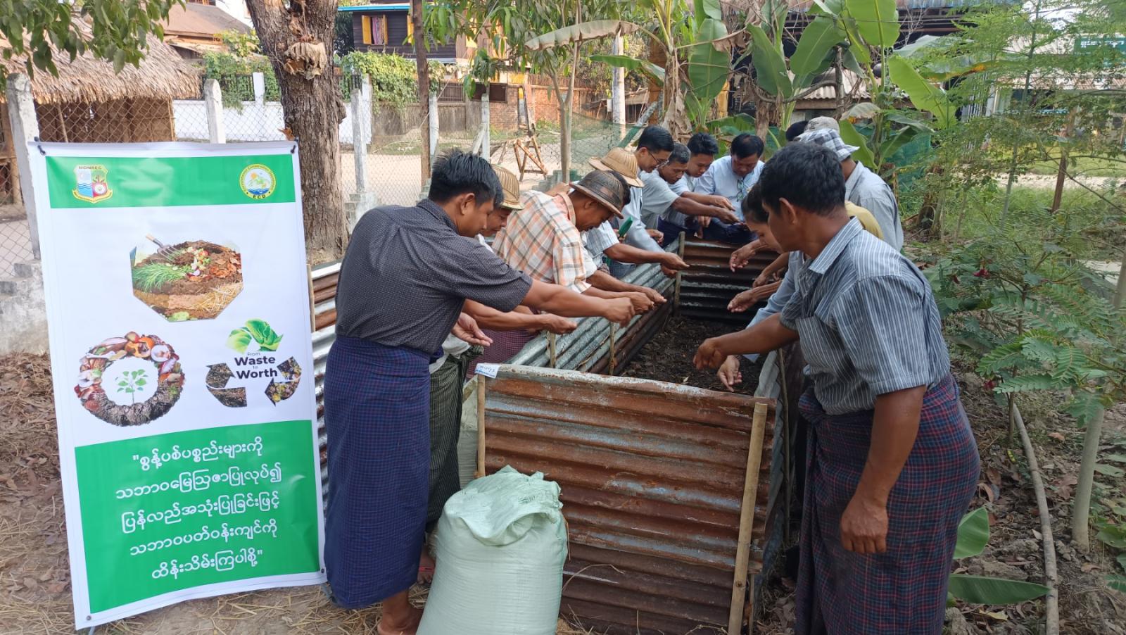 ဆက်လက်၍ ခရိုင်ပတ်ဝန်းကျင်ထိန်းသိမ်းရေးဦးစီးဌာနရုံးမှ ကျေးရွာရှိ အမှတ်(၅) အခြေခံပညာအလယ်တန်းကျောင်းတွင် စိုက်ပျိုးရေးဘေးထွက်ပစ္စည်းများနှင့် လူနေအိမ်များမှထွက်ရှိသော အမှိုက်များအား သဘာဝမြေသြဇာပြုလုပ်၍ ပြန်လည်အသုံးပြုခြင်းဆိုင်ရာ လက်တွေ့ဆောင်ရွက်ခြင်းများ ဆောင်ရွက်ခဲ့ပါကြောင်း သတင်းရရှိသည်။