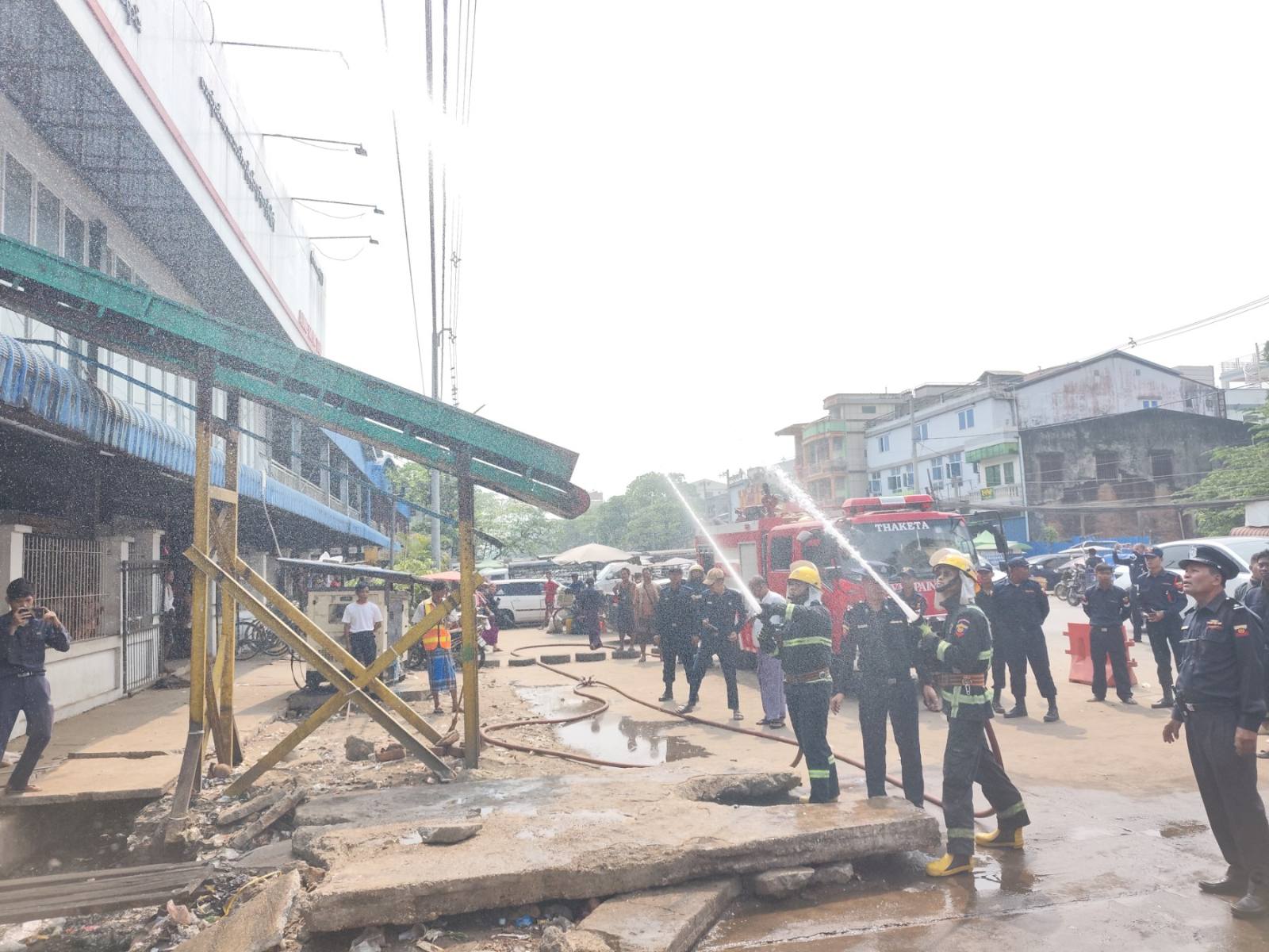 ယင်းနောက် မြို့နယ်မီးသတ်ဝန်ထမ်းများက လက်ကမ်းစာစောင်ဖြန့်ဝေခြင်း၊ 191 Report Application အား ပြည်သူများ၏ လက်ကိုင်ဖုန်းများတွင် ထည့်သွင်းပေးပြီး အသုံးပြုနည်းများ ရှင်းပြပေးခြင်း၊ မီးသတ်ဆေးဘူးကိုင်တွယ်အသုံးပြုနည်းနှင့် မီးငြှိမ်းသတ်နည်းများကို ရှင်းလင်းပြသ၍ ဈေးကော်မတီတာဝန်ရှိသူများ၊ ဈေးသူ/ဈေးသားများနှင့်အတူ အရေးပေါ် မီးငြှိမ်းသတ်နည်းများကို လက်တွေ့ပူးပေါင်းဆောင်ရွက်ခဲ့ကြပြီး ပြည်သူများ ပူးပေါင်းပါဝင်သည့် မီးသတ်ကားအသုံးပြု မီးငြှိမ်းသတ်နည်းများကို ဇာတ်တိုက်လေ့ကျင့်ခဲ့ကြကြောင်း သိရသည်။