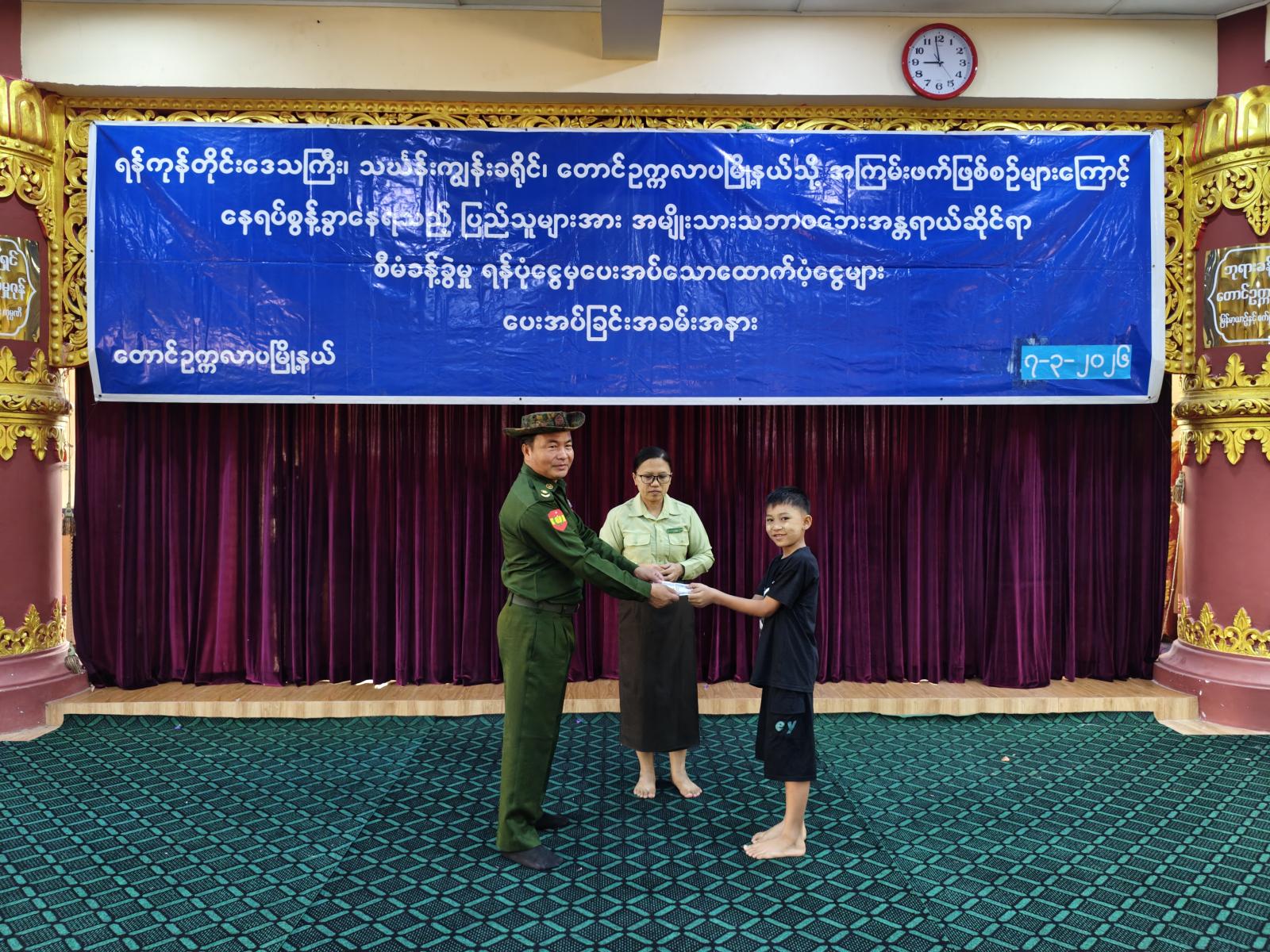 ရန်ကုန်တိုင်းဒေသကြီး၊ သင်္ဃန်းကျွန်းခရိုင်၊ တောင်ဥက္ကလာပမြို့နယ်အတွင်းသို့ ဒေသအသီးသီးမှ ယာယီနေရပ်စွန့်ခွာနေရသည့် ပြည်သူများအတွက် အမျိုးသားသဘာဝဘေးအန္တရာယ်ဆိုင်ရာ စီမံခန့်ခွဲမှုရန်ပုံငွေမှ ထောက်ပံ့ငွေပေးအပ်ပွဲအခမ်းအနားကို ယမန်နေ့နံနက်ပိုင်းက အမှတ် (၁၄) ရပ်ကွက် တောင်ဥက္ကလာပမြို့နယ်လုံးဆိုင်ရာ သုံးထပ်ဆောင်သာသနာ့ဗိမာန်တော်ကြီး၌ ကျင်းပခဲ့သည်။