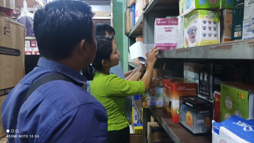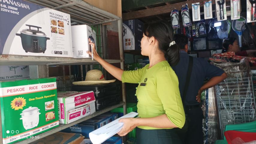 စားသုံးသူဦးစီးဌာန စားသုံးသူများအသုံးပြုမည့် ကုန်စည်များတွင် စားသုံးသူကာကွယ်ရေး ဥပဒေပါကုန်အညွှန်းအမှတ်အသား သတ်မှတ်ချက်များနှင့် ကိုက်ညီမှုရှိစေရေးအတွက် မြန်မာဘာသာဖြင့် ကုန်အညွှန်းအမှတ်အသား ဖော်ပြခြင်းနှင့်စပ်လျဥ်း၍ ကုန်စည်များတွင် မြန်မာဘာသာဖြစ်စေ၊ မြန်မာဘာသာနှင့် အခြားဘာသာတစ်ခု (သို့မဟုတ်) တစ်ခုထက်ပို၍ တွဲလျက်ဖြစ်စေဖော်ပြရန် ရည်ရွယ်၍ ရန်ကုန်တိုင်းဒေသကြီး သန်လျင်ခရိုင် သုံးခွမြို့နယ် စားသုံသူရေးရာဦးစီးဌာန၊ ကျန်းမာရေးဦးစီးဌာနနှင့် စည်ပင်သာယာရေးအဖွဲ့တို့ပူးပေါင်း၍ အိမ်သုံးလျှပ်စစ်ပစ္စည်းရောင်းချသည့်ဆိုင်များတွင် မြန်မာဘာသာဖြင့်ဖော်ပြထားမှု ရှိ/မရှိကို မတ် (၆) ရက်နေ့မွန်းလွဲ (၂) နာရီအချိန်က အသိပညာပေးစစ်ဆေးဆောင်ရွက်ခဲ့ကြောင်း သိရသည်။