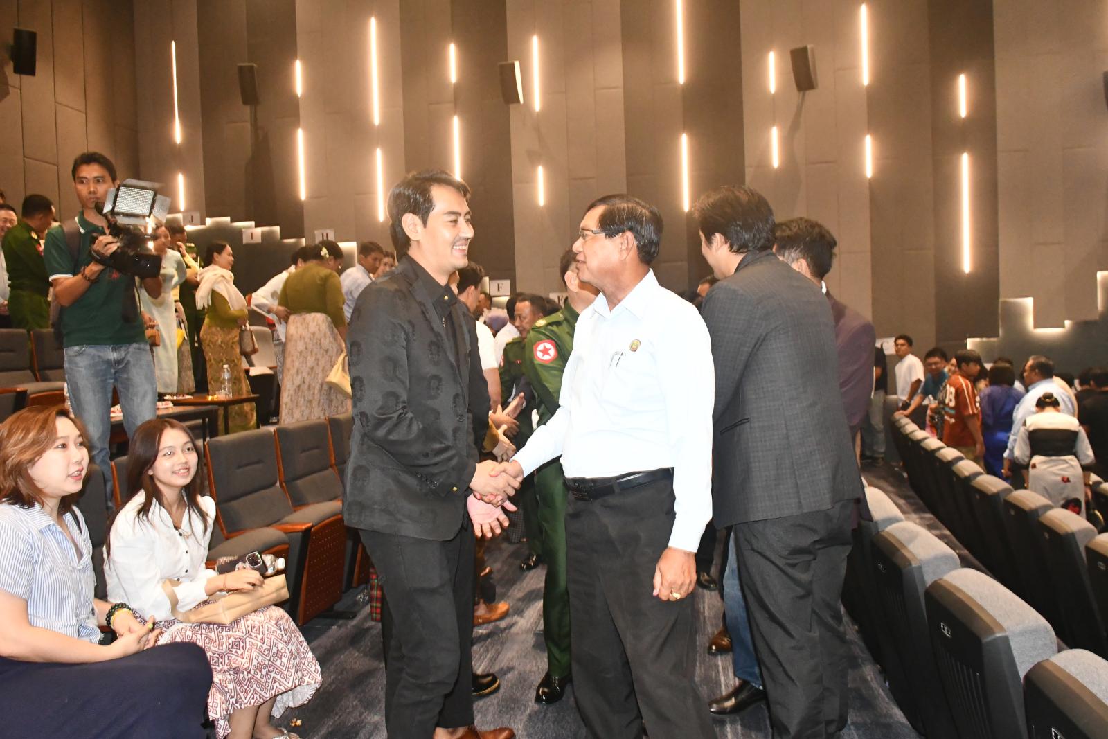 ၎င်းနောက် တိုင်းဒေသကြီး ရန်ကုန်တိုင်းဒေသကြီးဝန်ကြီးချုပ် ဦးစိုးသိန်းနှင့် တာဝန်ရှိသူများက တိမ်ပင်လယ်ခရီးကြမ်း (Battle Of Taung Hkam) ရုပ်ရှင်ဇာတ်ကားတွင် ပါဝင်ကြသည့် အနုပညာရှင်များအား ရင်းရင်းနှီးနှီးလိုက်လံ နှုတ်ဆက်ကြသည်။