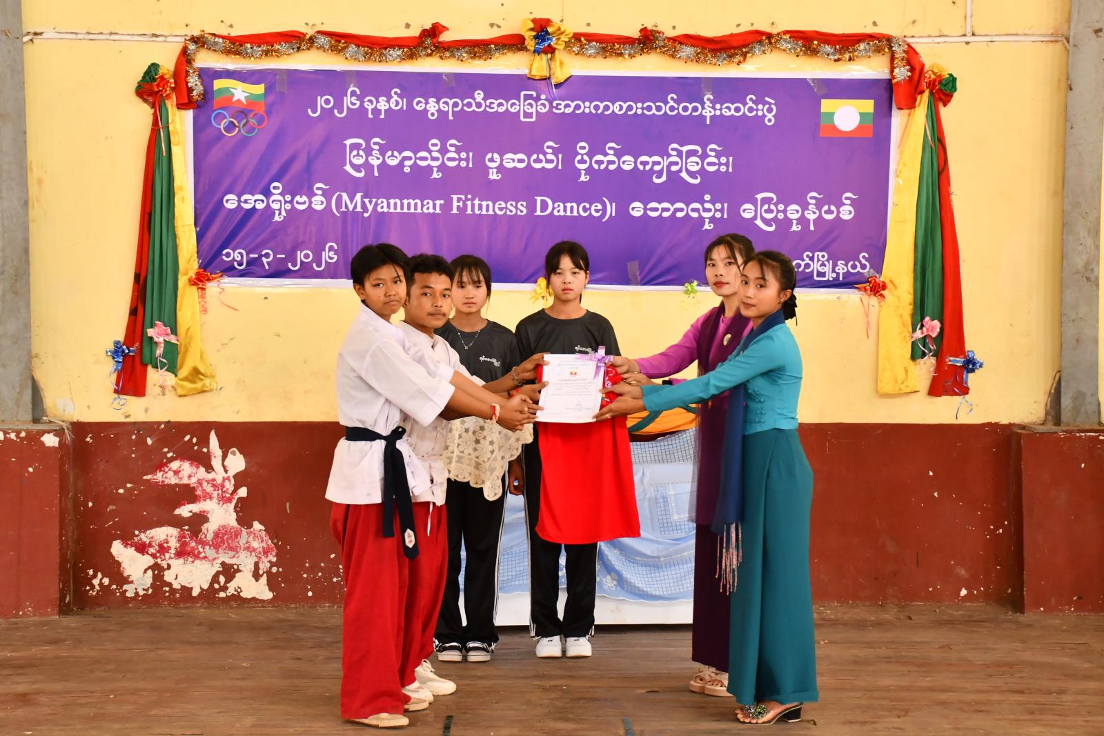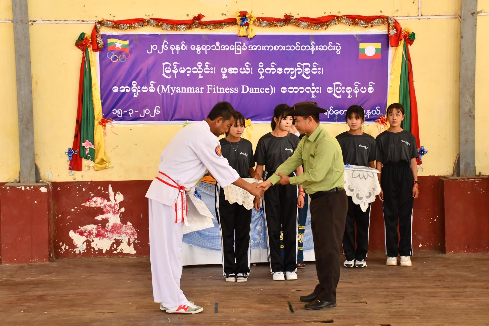 ဆက်လက်၍ ဒုတိယမြို့နယ်အုပ်ချုပ်ရေးမှူးနှင့် တာဝန်ရှိသူများက အားကစားသင်တန်းနည်းပြဆရာ၊ ဆရာမများနှင့် သင်တန်းသားများအား ဂုဏ်ပြုလက်ဆောင်၊ ဂုဏ်ပြုဆုငွေနှင့် ဂုဏ်ပြုမှတ်တမ်းလွှာများပေးအပ်ကာ သင်တန်းဆင်း သင်တန်းသား၊ သင်တန်းသူများအား သင်တန်းဆင်း အားကစားအင်္ကျီနှင့် သင်တန်းဆင်းအာင်လက်မှတ်များ ပေးအပ်ခဲ့ကြသည်။ ၎င်းနောက် မြန်မာ့သိုင်းအားကစားသမားများနှင့် အေရိုးဗစ်အားကစားသမားများမှ သရုပ်ပြဖျော်ဖြေတင်ဆက်ခဲ့ကြကြောင်း သိရှိရသည်။