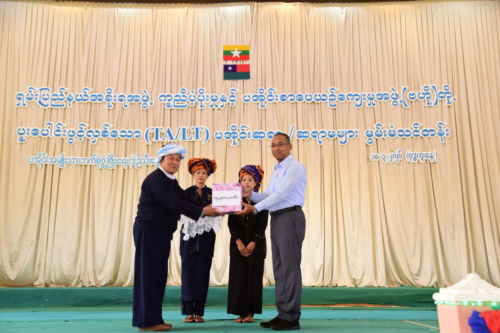 ထို့နောက် ပြည်နယ်ဝန်ကြီးချုပ် ဦးအောင်အောင်က သင်တန်းအတွက် ထောက်ပံ့ငွေကျပ် ပေးအပ်ရာ ပအိုဝ်းစာပေနှင့်ယဥ်ကျေးမှုအဖွဲ့(ဗဟို)ဥက္ကဋ္ဌ ဦးခွန်ဝင်းကိုမှ လက်ခံရယူသည်။