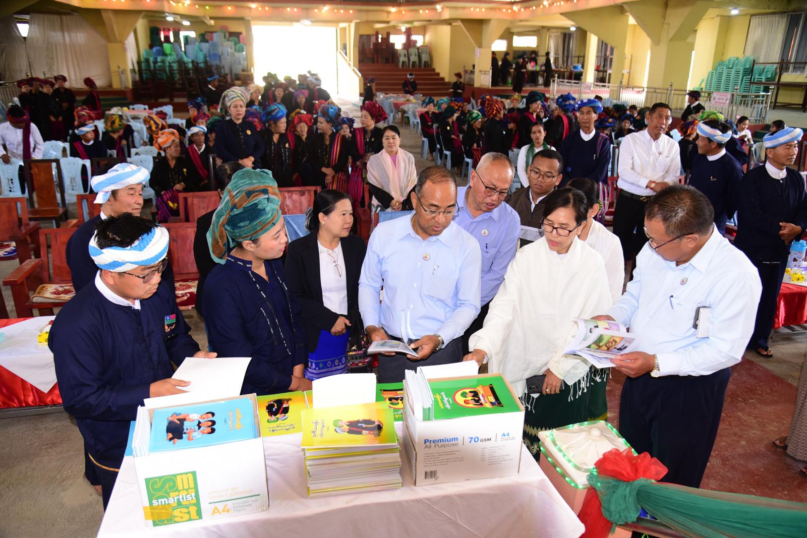 ယင်းနောက် ပြည်နယ်ဝန်ကြီးချုပ်နှင့် တာဝန်ရှိသူများသည် ခန်းမအတွင်း ခင်းကျင်းပြသထားသော ပအိုဝ်းစာပေသင်ရိုးညွှန်းတန်းပ ထမတန်း၊ ဒုတိယတန်း၊ တတိယတန်းဖတ်စာအုပ်များကို ကြည့်ရှုကြပြီး အခမ်းနားတက်ရောက်လာသူများအား ရင်းရင်းနှီးနှီး နှုတ်ဆက်ခဲ့ကြကြောင်း သိရှိရသည်။