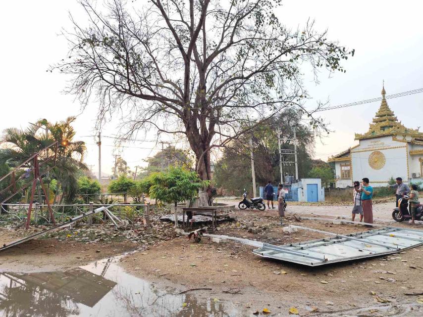 အဆိုပါ လေပြင်းတိုက်ခတ်မှုကြောင့် အမှတ် (၁) ရပ်ကွက်ရှိ စျေးရပ်ဓမ္မာရုံအဆောက်အဦ အမိုးလန်ခြင်းနှင့် အများပြည်သူသွားလာသည့်လမ်းများတွင် သစ်ပင်ပြိုလဲခြင်း၊ သစ်ကိုင်းကျိုးကျခြင်း၊ မြို့နယ်စည်ပင်သာယာရေးအဖွဲ့မှ စိုက်ထူထားသည့် မြေစိုက်ဗီနိုင်းပိုစတာများ ပြိုလဲပျက်စီးမှုများ ဖြစ်ပေါ်ခဲ့ပြီး လူနှင့်တိရစ္ဆာန်များ ထိခိုက်ဒဏ်ရာ ရရှိမှုမရှိကြောင်း သိရသည်။