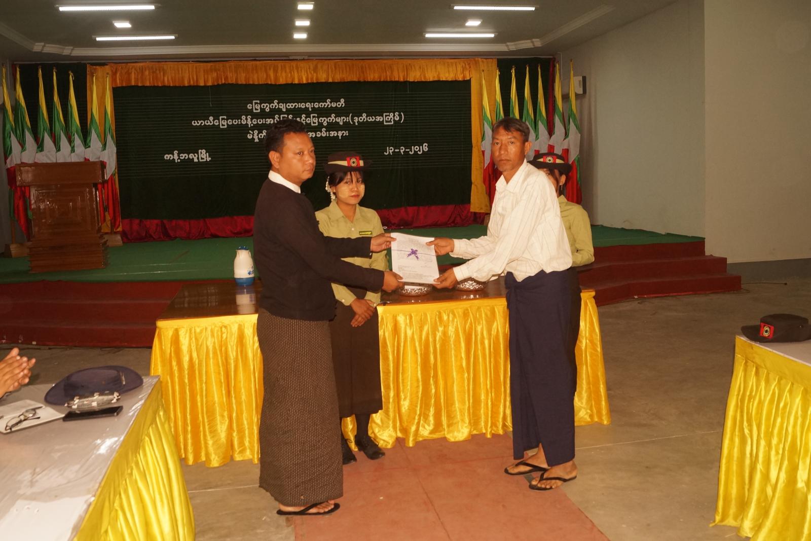 စစ်ကိုင်းတိုင်းဒေသကြီး ကန့်ဘလူခရိုင်အတွင်းရှိ နယ်မြေရှင်းလင်းရေးနှင့်လုံခြုံရေးတာ ဝန်ထမ်းဆောင်စဉ် ကျဆုံး/ကိုယ်လက်အင်္ဂါစွန့်လွှတ်ခဲ့သည် တပ်မတော်သား၊ မြန်မာနိုင်ငံရဲတပ်ဖွဲ့ဝင်များ၊ ပြည်သူ့စစ်အဖွဲ့ဝင်များနှင့် ပေးသင့်ပေးထိုက်သူများအား ယာယီမြေပေးမိန့်ပေးအပ်ခြင်းနှင့် မြေကွက်များ(ဒုတိယအကြိမ်) မဲနှိုက်ချထားသည့် အခမ်းအနားကို မတ် ၂၃ ရက် နံနက် ၁၀ နာရီက ကန့်ဘလူမြို့ရှိ ခရိုင်စုပေါင်းရုံး ရွှေဆည်မြိုင်ခန်းမ၌ ကျင်းပသည်။
