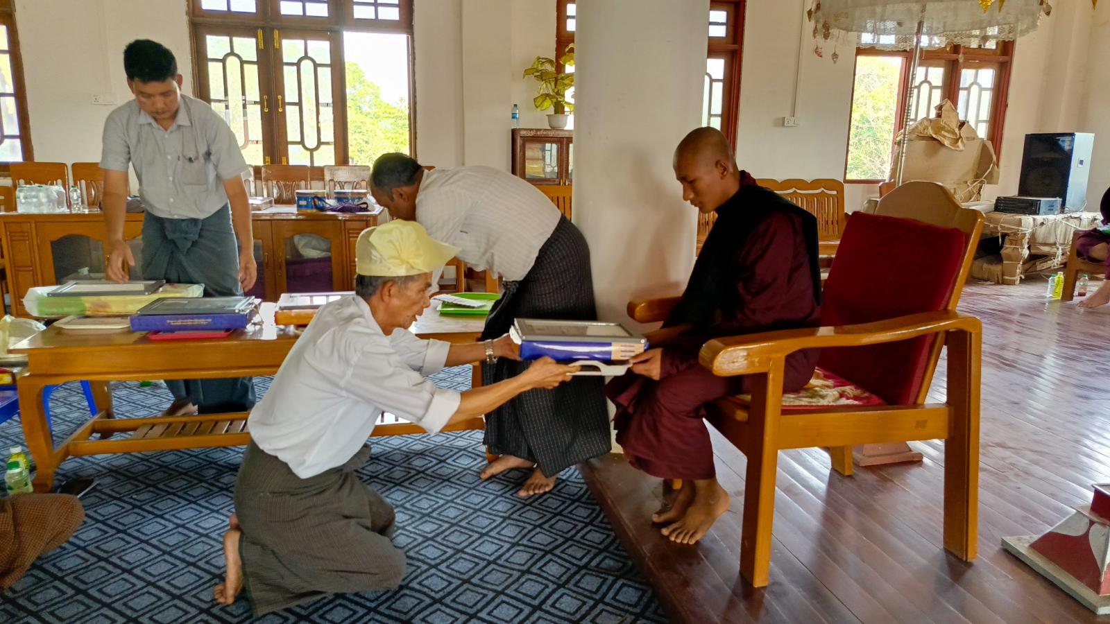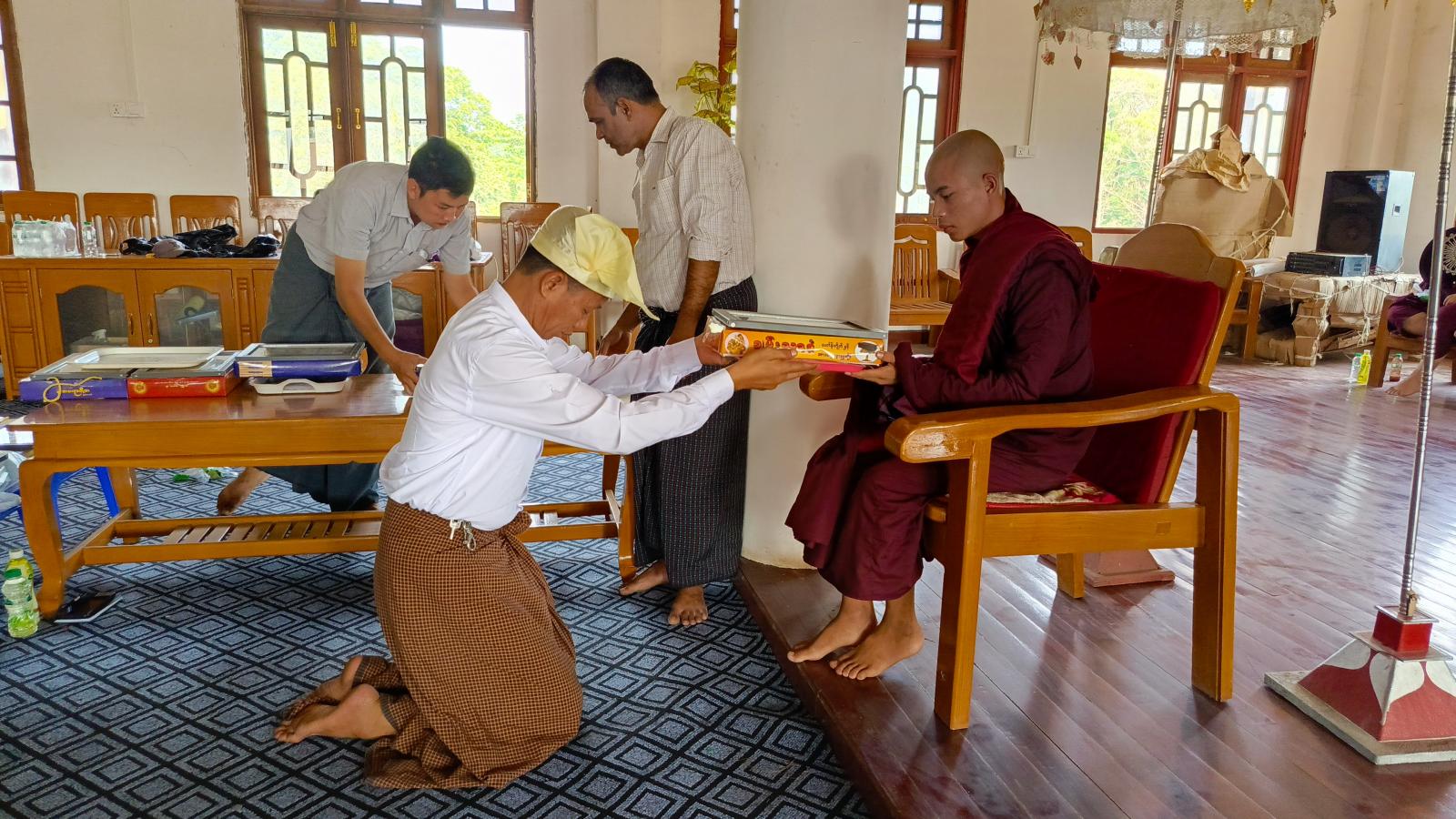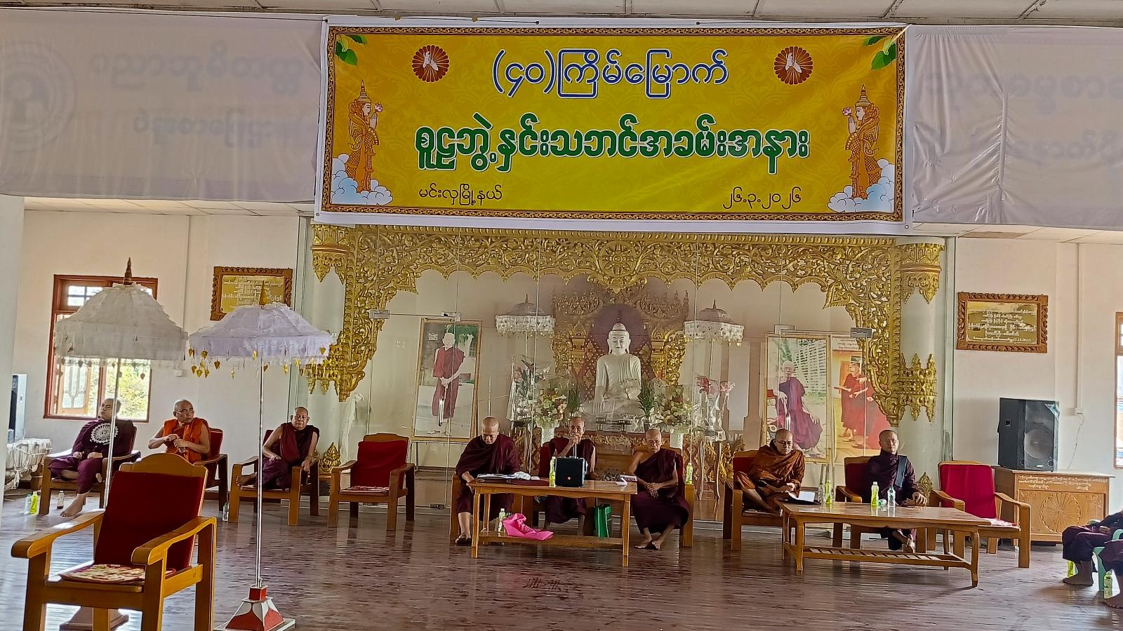 အခမ်းအနားကို သံဃာတော်အရှင်မြတ်တို့က နမောတဿသုံးကြိမ်ရွတ်ဆို၍ ဖွင့်လှစ်ခဲ့ပြီး မြို့နယ်သံဃနာယကဥက္ကဋ္ဌ အောင်ဇေယျုံကျောင်းတိုက်ဆရာတော် ဥူးပဏ္ဍိတထံမှ ဧည့်ပရိတ်သတ်များက ငါးပါးသီလခံယူဆောက်တည်ခဲ့ပြီး ဩဝါဒကထာများ မိန့်ကြားတော်မူခဲ့သည်။