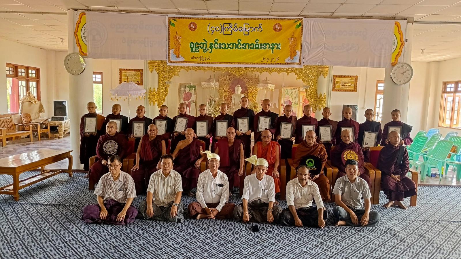 ထို့နောက် ၂၀၂၅ ခုနှစ် အစိုးရပါဠိပထမပြန်စာမေးပွဲကြီးတွင် မင်းလှစာဖြေဌာမှ ဖြေဆိုအောင်မြင်ခဲ့သည့် ပထမငယ် (၃)ပါး အခြေပြုမူလတန်း (၁၂)ပါး စုစုပေါင်း (၁၅)ပါးတို့အား အောင်လက်မှတ်နှင့် ဆုဝတ္ထုပစ္စည်းများအား တာဝန်ရှိသူများမှ အသီးသီးဆက်ကပ်လှူဒါန်းခဲ့၍ အခမ်းအနားကို ဗုဒ္ဓသာသနံစိရံတိဋ္ဌတု သုံးကြိမ်ရွတ်ဆို၍ ရုပ်သိမ်းခဲ့ကြောင်း သိရသည်။