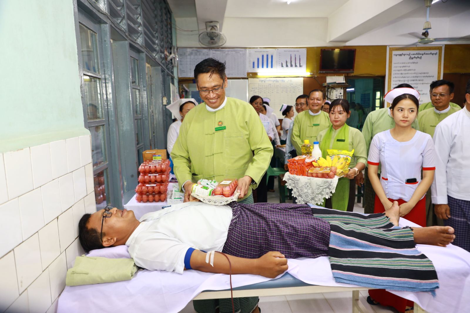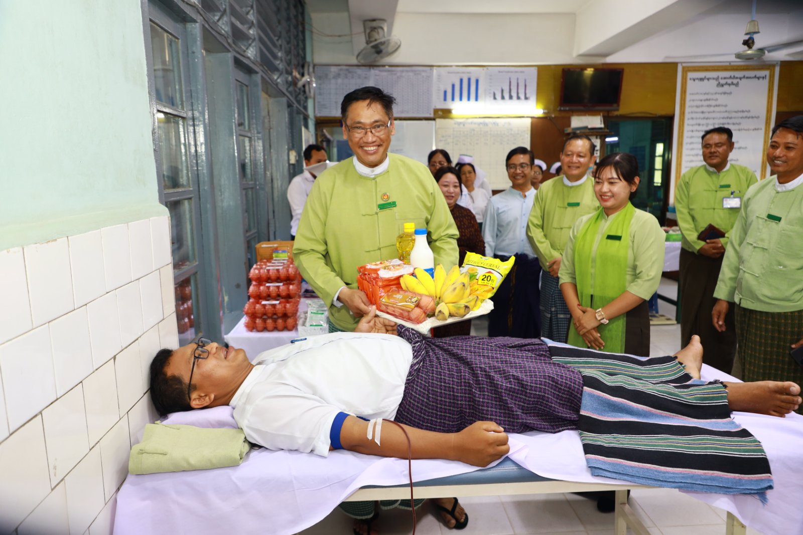 အဆိုပါ ပြည်နယ်/ခရိုင်/မြို့နယ်အထွေထွေအုပ်ချုပ်ရေးဦးစီးဌာနမှ သွေးလှူဒါန်းကြသည့် ဝန်ထမ်း(၃၅)ဦးအား ပြည်နယ်အထွေထွေအုပ်ချုပ်ရေးဦးစီးဌာန ပြည်နယ်အုပ်ချုပ်ရေးမှူး ဦးဉာဏ်လင်းဒွေး၊ ခရိုင်အုပ်ချုပ်ရေးမှူး ဦးထွန်းဝေ၊ မြို့နယ်အုပ်ချုပ်ရေးမှူး ဦးအောင်ဝင်းနိုင်နှင့်တာဝန်ရှိသူများက လိုက်လံကြည့်ရှုအားပေးပြီး သွေးအလှူရှင်များအတွက် အာဟာရဖြည့် စားသောက်ဖွယ်ရာများ ပေးအပ်ခဲ့ကြသည်။