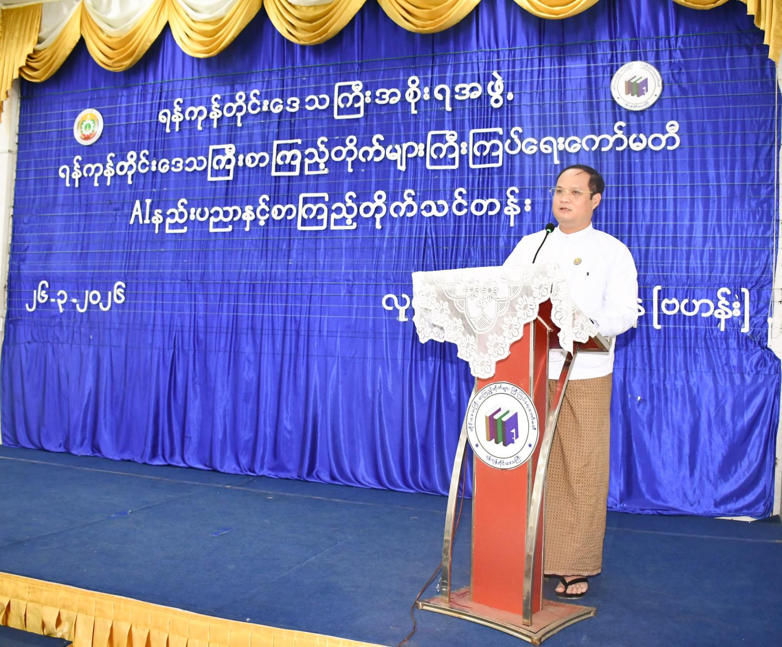 ဆက်လက်၍ ရန်ကုန်တိုင်းဒေသကြီး စာကြည့်တိုက်များကြီးကြပ်ရေးကော်မတီအဖွဲ့ဝင် ဒေါက်တာ ခင်လေးစိုးက AI နည်းပညာနှင့် စာကြည့်တိုက်သင်တန်း ဖွင့်လှစ်နိုင်မှုအခြေအနေ ရှင်းလင်းပြောကြားပြီး ရန်ကုန်တိုင်းဒေသကြီးအစိုးရအဖွဲ့ တိုင်းရင်းသားရေးရာဝန်ကြီးနှင့်တာဝန်ရှိသူများက AI နည်းပညာနှင့် စာကြည့်တိုက်သင်တန်း သင်တန်းထူးချွန်ဆုရရှိသူများနှင့်သင်တန်းသားများကို ထူးချွန်ဆုနှင့်သင်တန်းဆင်းလက်မှတ်များ ပေးအပ်ခဲ့ကြသည်။