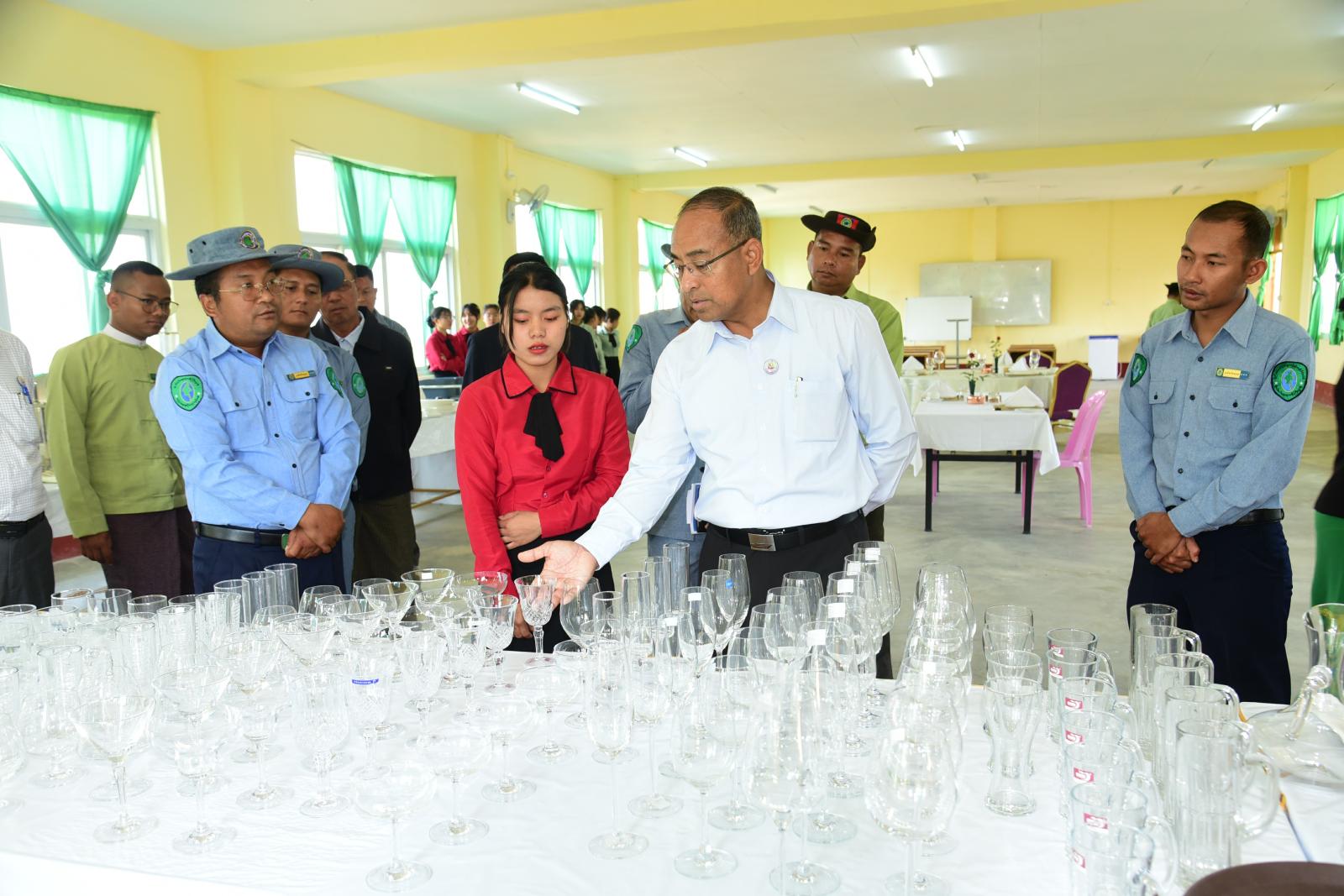 ယင်းနောက် သင်တန်းဆင်း သင်တန်းသား၊ သင်တန်းသူများကိုယ်စား သင်တန်းသူတစ်ဦးမှ ကျေးဇူးတင်စကားပြန်လည်ပြောကြားပြီး ပြည်နယ်ဝန်ကြီးချုပ်နှင့် တာဝန်ရှိသူများသည် ဟိုတယ်ဝန်ဆောင်မှုဆိုင်ရာလုပ်ငန်းဆက်စပ်ပစ္စည်းဖြင့် လက်တွေ့သရုပ်ပြသနေမှုကိုလည်းကောင်း၊ လျှပ်စစ်၊ လက်ကိုင်ဖုန်း၊ မော်တော်ယာဉ်အင်ဂျင်နှင့် အောက်ပိုင်းလက်တွေ့ပြင်ဆင်နေမှုတို့ကိုလည်းကောင်း ကြည့်ရှုအားပေးခဲ့ကြကြောင်း သိရသည်။