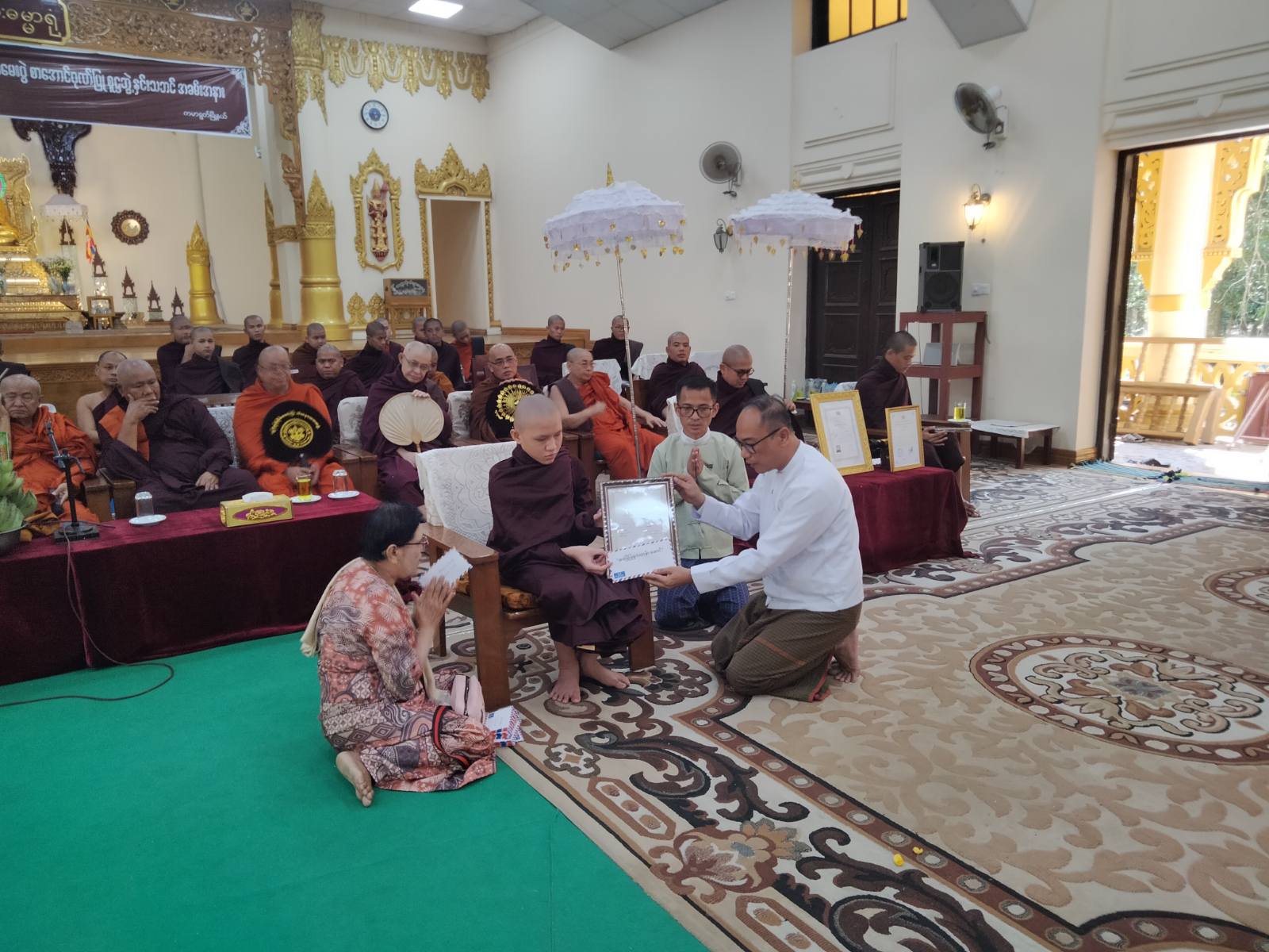 ဆက်လက်၍ ရန်ကုန်တိုင်းဒေသကြီးသံဃာနာယကအဖွဲ့ဥက္ကဋ္ဌ ဆရာတော် ထံမှငါးပါးသီလ ခံယူဆောက်တည်ကာ မြို့နယ်စီမံခန့်ခွဲရေးနှင့် အုပ်ချုပ်ရေးကော်မတီဥက္ကဋ္ဌ ဦး ကောင်းမြင့်သူက သာသနာရေးဆိုင်ရာများကို လျှောက်ထားခဲ့ပြီး အလှူရှင်များအားဂုဏ်ပြုမှတ်တမ်းလွှာများ ပေးအပ်ခဲ့သည်။
