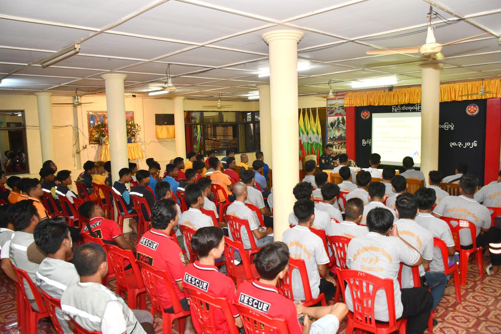 အသိပညာပေး ဆွေးနွေးရာတွင် ခရိုင်မီးသတ်ဦးစီးမှူး ဦးဇော်ဝင်းက မီးလောင်မှုအခြေခံ သဘောတရားများ၊ မီးလောင်မှုများတွင် ဖြစ်ပွားတတ်သောဘေးအန္တရာယ်များ၊ ဘေးအန္တရာယ် ဖြစ်ပွားသည့်နေရာသို့ ချဉ်းကပ်ဝင်ရောက်နည်းများ၊ အသက်ကယ်နည်းစနစ်များ၊ လူနာသယ်ဆောင်နည်းများ၊ အဖွဲ့အစည်းအလိုက် လုပ်ဆောင်ရမည့်လုပ်ငန်းစဉ်များ၊ မီးသတ်တပ်ဖွဲ့သို့ ကူညီဆောင်ရွက်ပေးရမည့် ကဏ္ဍများ၊ မီးသတ်ယာဉ်၊ လူနာတင်ယာဉ်နှင့် အခြားအရေးကြီးယာဉ်များ နေရာယူရမည့်စနစ်များအကြောင်းကို အကျယ်တဝင့် ပညာပေး ဟောပြောဆွေးနွေးသည်။