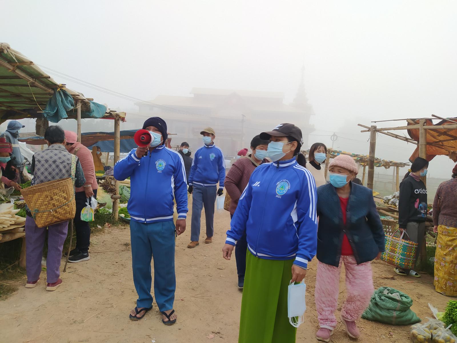 Mask Campaign ပြုလုပ်ရာသို့ မြို့နယ်စည်ပင်သာယာရေးဌာနမှ ဒုတိယဦးစီးမှူး ဒေါ်ခင်သီသီထွန်း ဦးဆောင်၍ ၀န်ထမ်းများလိုက်ပါလျက် ပျံကျစျေးအတွင်းတွင် သားငါး၊ ကုန်ခြေက်၊ ကုန်စိမ်းရောင်းချသူများထံမှ ကိုဗစ်-၁၉ ရောဂါ ကူးစက်မှုမခံရစေရေးအတွက် Mask တပ်ဆင်ထားခြင်းမရှိသည့် စျေးသည်များထံမှ စျေး၀ယ်ယူခြင်းမပြုစေရေး အသိပညာ ပေးခြင်း လုပ်ငန်းများ၊ Mask Campaign များကို အခမဲ့ဖြန့်ဝေပေးခြင်း လုပ်ငန်းများနှင့် ကျန်းမာရေးနှင့် အားကစား၀န်ကြီးဌာနမှ ထုတ်ပြန်ထားသော ကျန်းမာရေးဆိုင်ရာညွှန်ကြားချက်များကို လိုက်နာဆောင်ရွက်ကြစေရေးအတွက် အသိပညာပေးခြင်း လုပ်ငန်းများကို ကွင်းဆင်းဆောင်ရွက်ခဲ့ကြကြောင်း သိရသည်။
