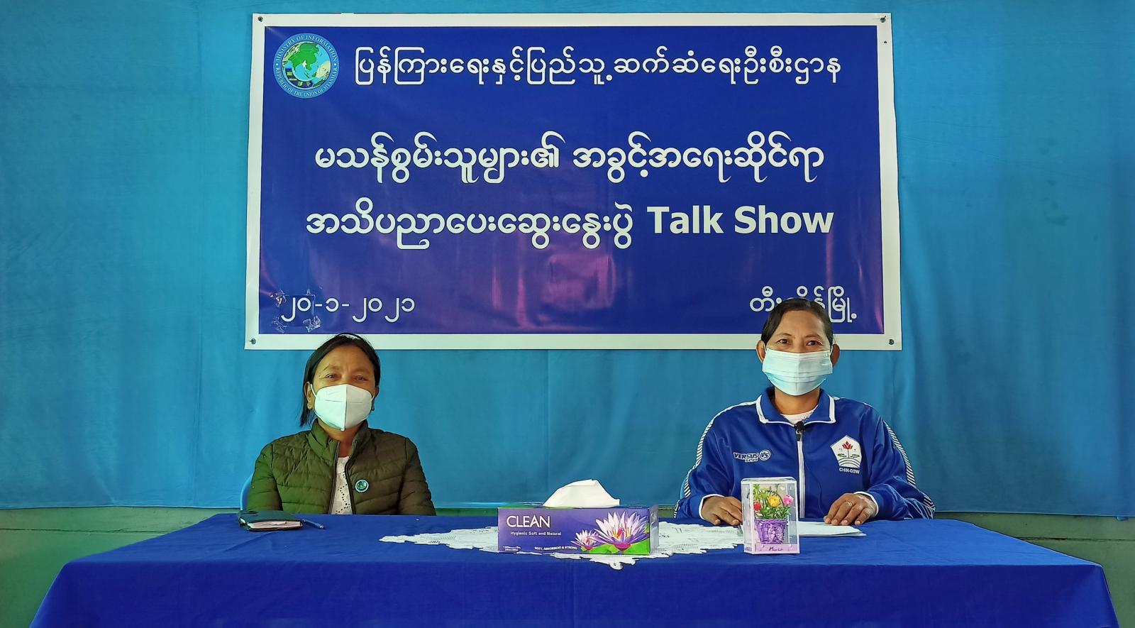 ချင်းပြည်နယ်၊ တီးတိန်မြို့နယ်ပြန်ကြားရေးနှင့်ပြည်သူ့ဆက်ဆံရေးဦးစီးဌာနနှင့် မြို့နယ်လူမှု ဝန်ထမ်း ဦးစီးဌာနတို့ ပူးပေါင်းပြီး မသန်စွမ်းသူများ၏အခွင့်အရေးများဆိုင်ရာ အသိပညာပေးဆွေးနွေးပွဲ Talk Show ကို ယမန်နေ့နံနက် ၁၀ နာရီက တီးတိန်မြို့ နယ် ပြန်ကြားရေးနှင့်ပြည်သူ့ဆက်ဆံရေးဦးစီးဌာန Community Centre ခန်းမ၌ ပြုလုပ်ကြောင်း သိရသည်။