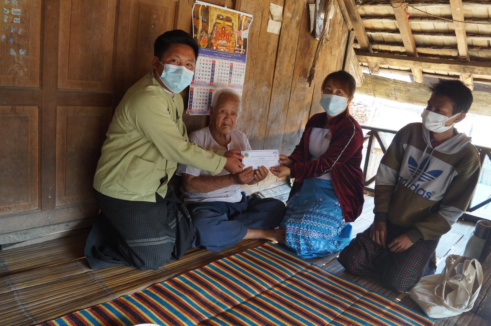 ထောက်ပံ့ပေးအပ်ရာသို့ မြို့နယ်လူမှုဝန်ထမ်းဦးစီးဌာနမှ ဒေါ်မာဂရက်(အငယ်တန်းစာရေး)၊ ဦးမာကု(လူမှု-၄)၊ ရပ်ကွက်အုပ်ချုပ် ရေးမှူးများနှင့် စာရေးဝန်ထမ်းတို့က ဘိုးဘွားတစ်ဦးလျှင် (၃၀,၀၀၀) ကျပ်နှုန်းဖြင့် သွားရောက် ထောက်ပံ့ပေးအပ်ခဲ့ကြောင်း သိရသည်။