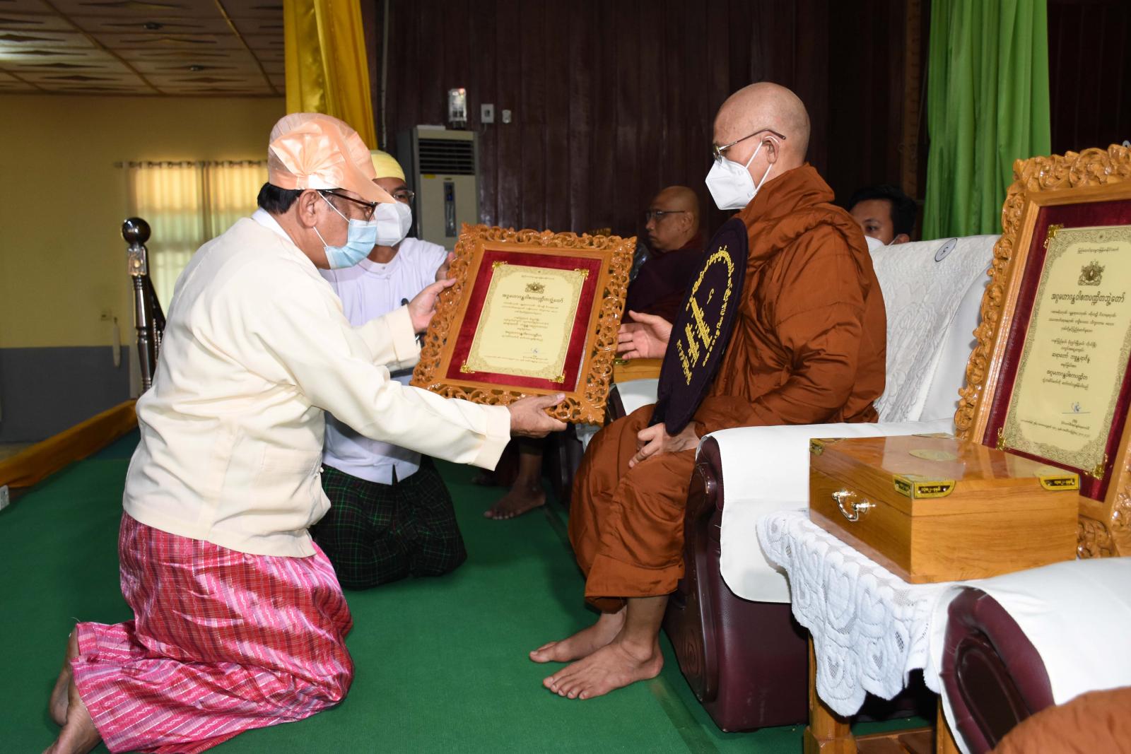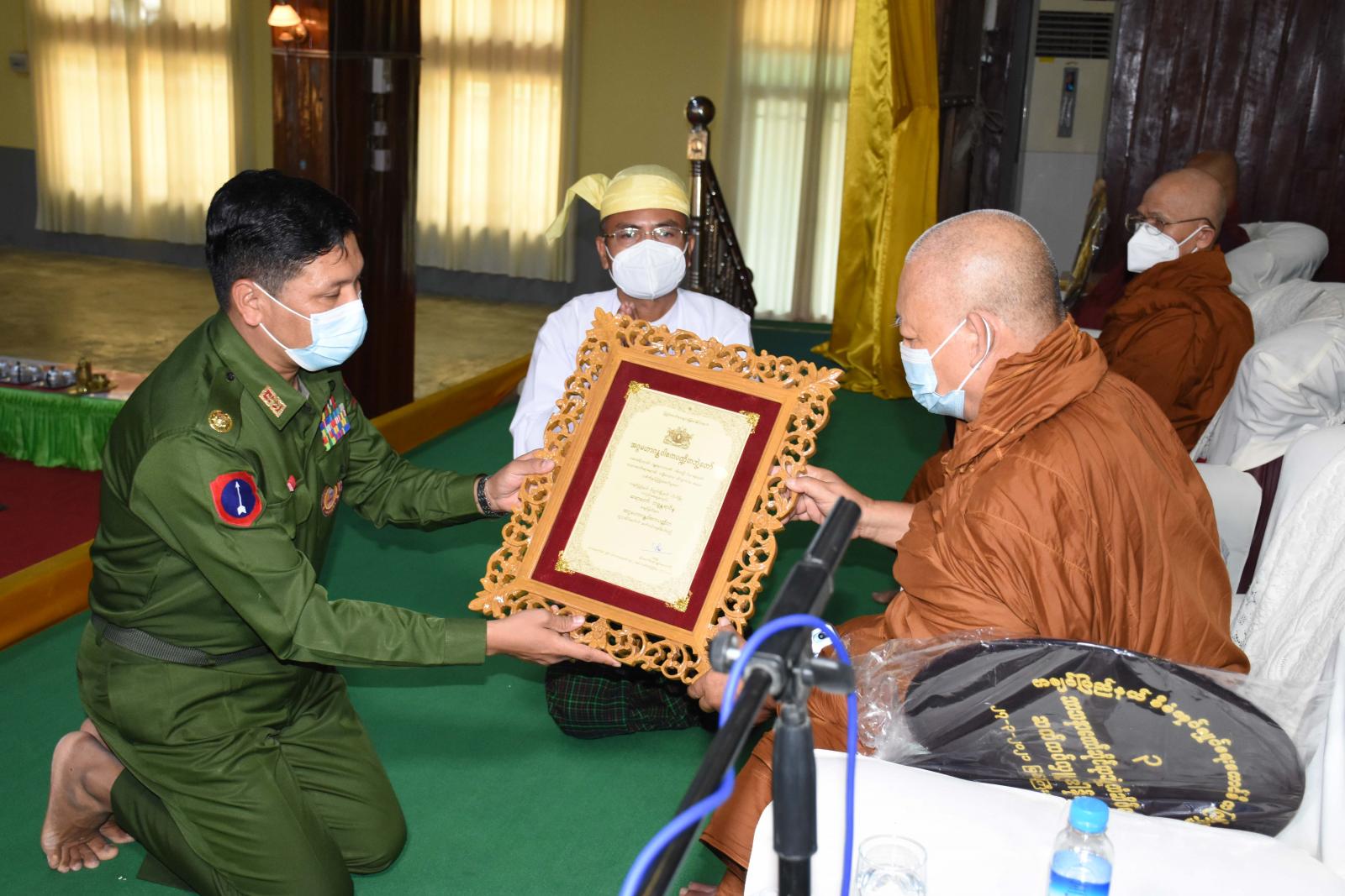 ထို့နောက် မြောက်ပိုင်းတိုင်းစစ်ဌာနချုပ်တိုင်းမှူး၊ ဒုတိုင်းမှူးနှင့် တပ်မတော်အရာရှိကြီးများ၊ ပြည်နယ် ကောင်စီအဖွဲ့ဝင်များက သာသနာဆိုင်ရာ ဘွဲ့တံဆိပ်တော်များဖြစ်သည့် အဂ္ဂမဟာဂန္ထဝါစက ပဏ္ဍိတ၊ အဂ္ဂမဟာသဒ္ဓမ္မဇောတိကဓဇ၊ မဂ္ဂမဟာကမ္မဌာနစရိယ၊ မဟာသဒ္ဓမ္မဇောတိကဓဇ၊ ဂန္ထဝါစက ပဏ္ဍိတ၊ သဒ္ဓမ္မဇော်တိကဓဇ ဘွဲ့တံဆိပ်တော်ရ ဆရာတော်၊ သံဃာတော် မထေရ်မြတ် (၁၄)ပါးတို့အား ဘွဲ့တံဆိပ်တော်များကို အသီးသီး ဆက်ကပ်လှူဒါန်းကြပြီး ပြည်နယ်ဥပဒေချုပ်က သဒ္ဓမ္မဇောတိကဓဇ (သီလရှင်)ဘွဲ့တံဆိပ်တော်ရ သီလရှင်ဆရာကြီးအားလည်းကောင်း၊ ပြည်နယ်တရားလွှတ်တော်တရား သူကြီးချုပ်က သဒ္ဓမ္မဇောတိကဓဇ(လူပုဂ္ဂိုလ်)ဘွဲ့ရ ဦးဒီးဒုတ်အားလည်းကောင်း ဘွဲ့တံဆိပ်တော်များ ဆက်ကပ်အပ်နှင်းခဲ့ကြသည်။