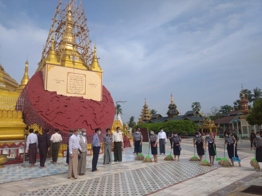 ထို့နောက် မြန်မာလူမျိုးတို့၏ ထုံးတမ်းအစဉ်အလာ တစ်ရပ်နှင့်အညီ ရွှေမော်ဓောစေတီတော်မြတ်ကြီးရှိ စေတီပုထိုးများအား ရေသပ္ပာယ်ခြင်း၊ ရင်ပြင်တော်အတွင်း သန့်ရှင်းရေး ဆောင်ရွက်နေသည့် တပ်မတော်သားများ၊ မြန်မာနိုင်ငံရဲတပ်ဖွဲ့ဝင်များ၊ မြန်မာနိုင်ငံမီးသတ်တပ်ဖွဲ့ဝင်များ၊ အထွေထွေအုပ်ချုပ်ရေး ဦးစီးဌာနဝန်ထမ်းများနှင့် ဌာနဆိုင်ရာများက သန့်ရှင်းရေးဆောင်ရွက်မှုများ ကြည့်ရှုအား ပေးခဲ့ကြောင်း သိရသည်။