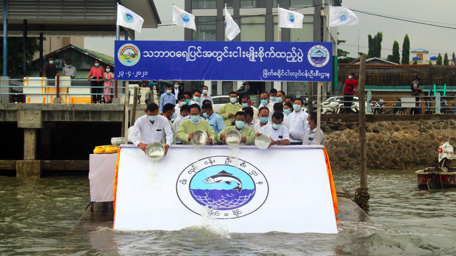 ငါးမျိုးစိုက်ထည့်ရာတွင် မြိတ်ခရိုင် စီမံအုပ်ချုပ်ရေးအဖွဲ့ ဉက္ကဌ ဦးအောင်ကျော်ဦး၊ ငါးလုပ်ငန်းဦးစီးဌာန တိုင်းဒေသကြီးဦးစီးဌာနမှူး ဦးသံချောင်း နှင့် ဌာနဆိုင်ရာတာဝန်ရှိသူများ၊ တိုင်းဒေသကြီးနှင့်မြိတ်ခရိုင် ငါးလုပ်ငန်း အဖွဲ့ချုပ်မှ တာဝန်ရှိသူများနှင့် တက်ရောက်လာကြသူ များက ဆိပ်ခံတံတားမှ ကကတက်ငါးသားပေါက်များ မျိုးစိုက်ထည့်ခဲ့ကြကြောင်း သိရသည်။