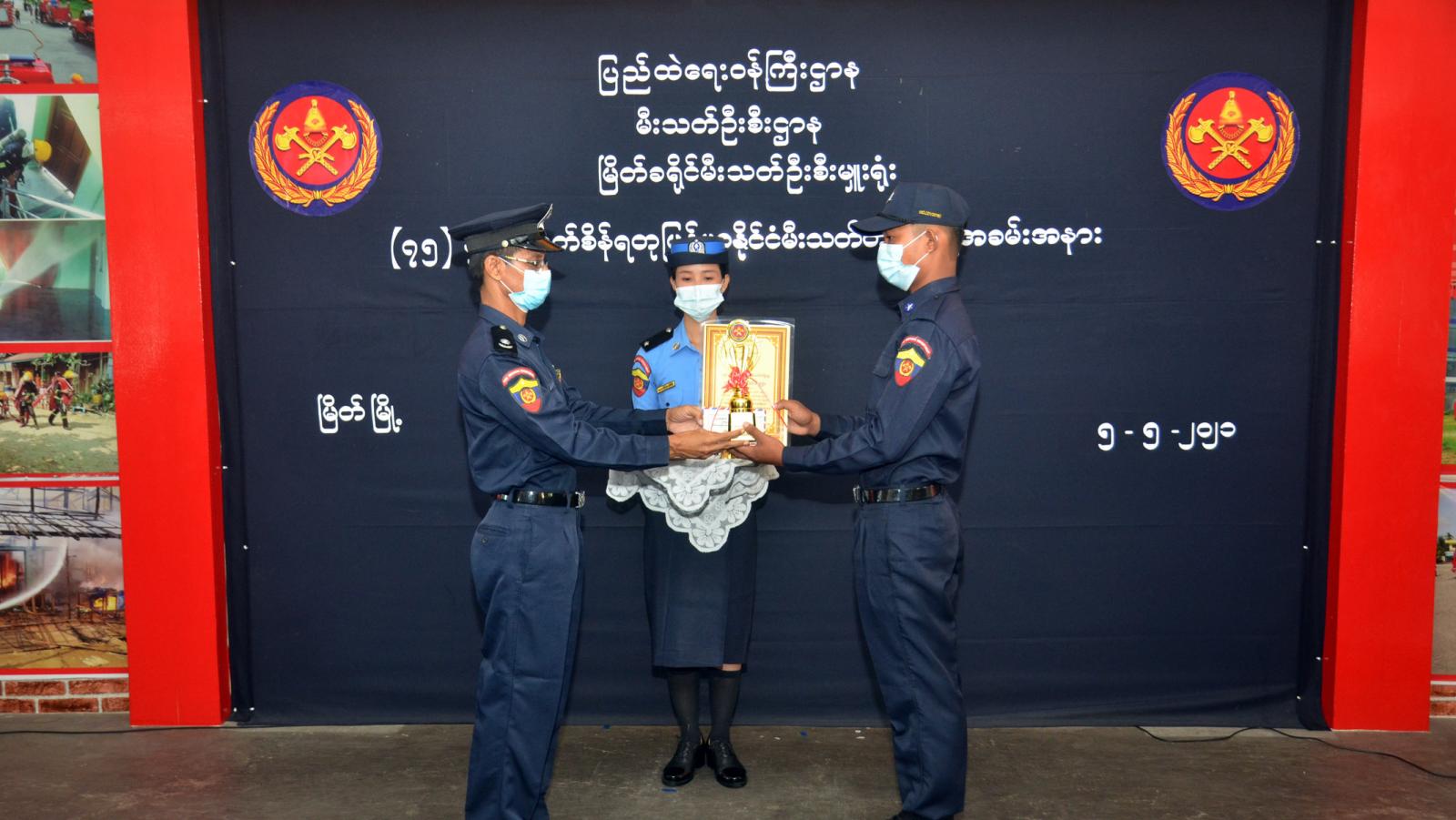 ထို့နောက် မီးဘေးကာကွယ်ရေး လုပ်ငန်းများတွင် မီးသတ်ဦးစီးဌာနနှင့် ပူးပေါင်း ဆောင်ရွက်ကြသည့် အရန်မီးသတ်စခန်းများနှင့် အရန်မီးသတ်တပ်ရင်းများ၊ စွမ်းစွမ်းတမံ ဆောင်ရွက်ကြသည့် တပ်ဖွဲ့ဝင်များအား ဂုဏ်ပြုဆုတံဆိပ်များနှင့် ဂုဏ်ပြုလက်မှတ်များ၊ ခရိုင်အဆင့်နှင့် တိုင်းဒေသကြီး အဆင့် မီးသတ်ကျင့်ဝတ် ဖြေဆို ပြိုင်ပွဲတွင် ဆုရရှိသူများအား ဆုတံဆိပ်၊ ဂုဏ်ပြုလက်မှတ်နှင့် မီးသတ်တပ်ဖွဲ့နေ့ဂုဏ်ပြု ပိုက်ကျော်ခြင်း ပြိုင်ပွဲတွင် ပထမဆုနှင့် ဒုတိယဆုရရှိကြသူများအား လည်ဆွဲဆုနှင့် ငွေသားဆုတို့ကို ခရိုင်မီးသတ်ဦးစီးဌာနမှူး နှင့် တာဝန်ရှိသူများက ဆုများ အသီးသီး ပေးအပ်ချီးမြှင့်ခဲ့ကြသည်။