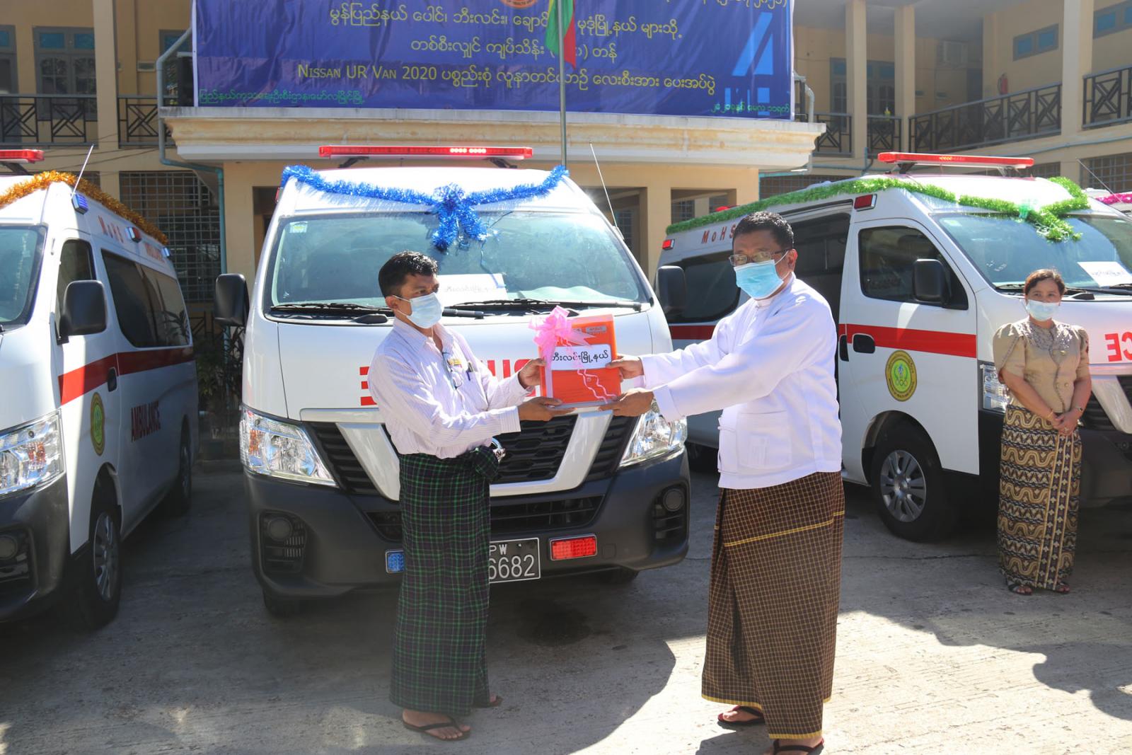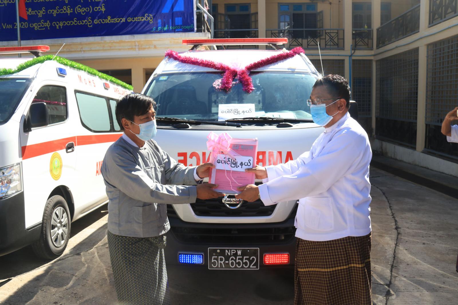 လူနာတင်ယာဉ်ပေးအပ်ပွဲတွင် မွန်ပြည်နယ်စီမံအုပ်ချုပ်ရေးကောင်စီဥက္ကဋ္ဌ ဦးဇော်လင်းထွန်းက မွန်ပြည်နယ်အတွင်းရှိ ဘီးလင်းမြို့နယ်၊ ပေါင်မြို့နယ်၊ ချောင်းဆုံမြို့နယ်နှင့် မုဒုံမြို့နယ်ကျန်းမာရေးဦးစီး ဌာနမှူးများထံသို့ ကျပ်သိန်း (၆၉၀) တန် Nissan UR Van 2020 ပစ္စည်းစုံ လူနာတင်ယာဉ် (၄) စီးနှင့် ပတ်သက်သော စာရွက်စာတမ်းများကို လွှဲပြောင်းပေးအပ်ပြီး လူနာတင်ယာဉ်များအား လှည့်လည်ကြည့် ရှုခဲ့သည်။