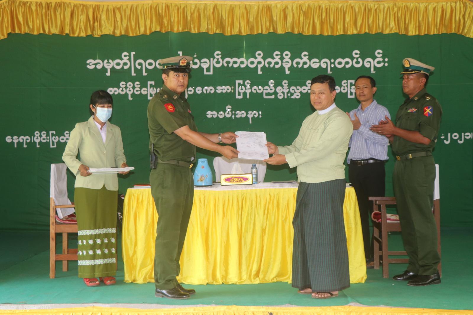 ဆက်လက်၍ သံချပ်ကာတပ်ရင်းခန်းမ၌ မြေယာပေးအပ်ပွဲအခမ်းအနားကို ကျင်းပပြုလုပ်ရာ ခရိုင် လယ်ယာမြေနှင့် အခြားမြေများသိမ်းဆည်းခြင်းခံရမှုများ ပြန်လည်စိစစ်ရေးကော်မတီဥက္ကဋ္ဌ၊ ဦးမြင့်နိုင်က တပ်မှ မူလပိုင်ရှင်များထံသို့ ပြန်လည်ပေးအပ်နိုင်ရေးအတွက် နိုင်ငံတော်သို့ပြန်လည်စွန့်လွှတ်လာခြင်း ဖြစ်ကြောင်း၊ ပြန်လည်စွန့်လွှတ်လာသည့်မြေများသည် ကျေးရွာပိုင်ဆိုင်မှုရရှိနိုင်ရေးအတွက်ဥပဒေ၊ လုပ်ထုံး လုပ်နည်းများနှင့်အညီ ကျေးရွာနေပြည်သူများ အမည်ပေါက်ရရှိနိုင်ရေး အလေးထားဆောင်ရွက်သွားမည် ဖြစ်ကြောင်းနှင့်စပ်လျဉ်း၍ အမှာစကားပြောကြားသည်။