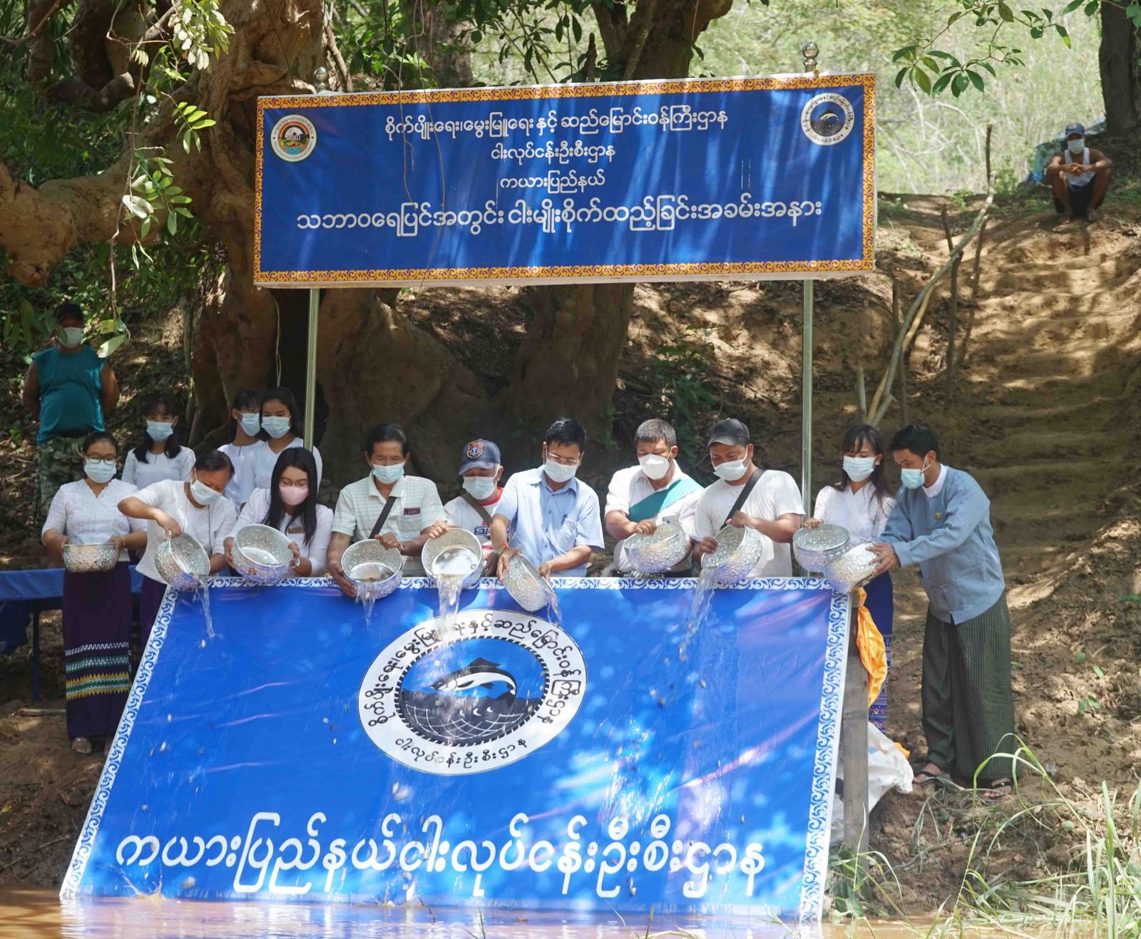 ကယားပြည်နယ် ငါးလုပ်ငန်းဦးစီးဌာနသည် ပြည်နယ်အတွင်း ငါးသယံဇာတများ ထိန်းသိမ်းစေရေး၊ ငါးမျိုး ပြန့်ပွားစေရေး၊ ငါးထုတ်လုပ်မှုတိုးတက်စေရေးနှင့် ဒေသခံတိုင်းရင်းသားပြည်သူများ အလုပ်အကိုင်နှင့် ဝင်ငွေရရှိစေရေးအတွက် ရည်ရွယ်၍ ပြည်နယ်အတွင်းရှိ သဘာဝရေပြင်များဖြစ်သည့် ရေကန်များ၊ ချောင်းများနှင့် ဆည်တမံများအတွင်းသို့ ငါးမျိုးများစိုက်ထည့်ခြင်းကို နှစ်စဉ်ဆောင်ရွက်လျက်ရှိရာ ယခုနှစ်တွင် ဒုတိယအကြိမ် ငါးမျိုးများ စိုက်ထည့်မှုအဖြစ် ယနေ့နံနက် ၁၀ နာရီတွင် ဘောလခဲခရိုင်၊ ဖားဆောင်းမြို့နယ် ထူးချောင်းသဘာဝ ရေပြင်အတွင်းသို့ ရွှေဝါငါးကြင်းငါးသားပေါက်ကောင်ရေ (၂၀၀၀၀) တို့အား ငါးမျိုးစိုက်ထည့်ခြင်း အခမ်းအနားကို ကျင်းပခဲ့သည်။