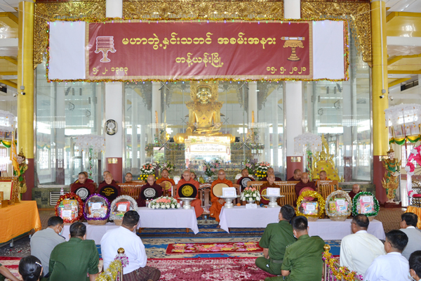 ယင်းနောက် နိုင်ငံတော်အစိုးရမှ ဆက်ကပ်လှူဒါန်းခဲ့သော သာသနာတော်ဆိုင်ရာ အဂ္ဂမဟာသဒ္ဒမ္မ ဇောတိကဓဇ (၁/၂၀၂၀) ဘွဲ့တံဆိပ်တော်ရ ဆရာတော်ကြီး (၁) ပါး၊ ဂန္တဝါစကပဏ္ဍိတ(၁/၂၀၂၁) ဘွဲ့တံဆိပ် တော်ရ ဆရာတော်ကြီး (၁)ပါး၊ မဟာသဒ္ဒမ္မဇောတိကဓဇ(၁/၂၀၂၀) သီလရှင်ဆရာကြီး (၁)ပါးတို့အား ဘွဲ့တံ ဆိပ်တော်နှင့် အဆောင်အယောင်များ၊ လှူဒါန်းဖွယ်ရာများ၊ ၂၀၂၀-ပြည့်နှစ် အစိုးရဓမ္မာစရိယစာမေးပွဲ ဖြေဆို အောင်မြင်တော်မူခဲ့ကြသော သာသနဓဇဓမ္မာစရိယဘွဲ့ရ ရဟန်းရှင်သာမဏေ (၁၂)ပါးနှင့် သီလရှင် (၁၀)ပါး စုစုပေါင်း(၂၅)ပါးတို့အား စစ်ဗျူဟာမှူးကြီး ဗိုလ်မှူးကြီးခွန်အောင်သွင်၊ မြို့နယ်အုပ်ချုပ်ရေးမှူး ဦးသက်လွင်ထွန်းနှင့် တာဝန်ရှိသူများ၊ အလှူရှင်များက ဘွဲ့တံဆိပ်တော်နှင့်လှူဒါန်းဖွယ်ရာများကို ဆက်ကပ် ပူဇော်လှူဒါန်းခဲ့ကြကြောင်း သိရသည်။