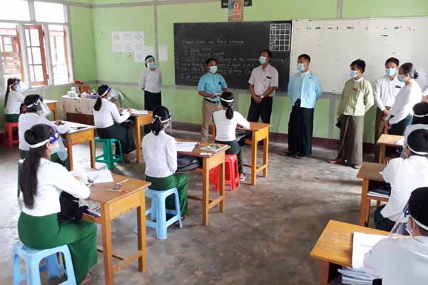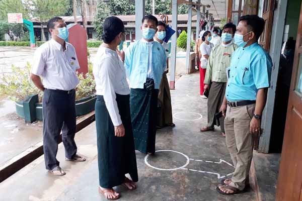 ထိုသို့ ကွင်းဆင်းကြည့်ရှုစစ်ဆေးရာ ပြည်နယ်ပြည်သူ့ ကျန်းမာရေးဦးစီးဌာနမှ သွားဘက်ဆိုင်ရာ လက်ထောက် ညွှန်ကြားရေးမှူး ဒေါက်တာဝင်းနိုင်ထွန်းနှင့် တာဝန်ရှိသူများ၊ မြို့နယ်ပညာရေးမှူး ဦးသိန်းထွန်းဦး၊ မြို့နယ်ပြည်သူ့ ကျန်းမာရေးဦးစီးဌာနမှ ဒေါက်တာ စိုးသန်းထိုက်နှင့် ကျန်းမာရေးဝန်ထမ်းများက ကိုဗစ် - ၁၉ ရောဂါ ကြိုတင်ကာကွယ် တားဆီးနိုင်ရေး လမ်းညွှန်ချက်များနှင့်အညီ ကျောင်းဝင်းသန့်ရှင်းသာယာမှု၊ ကျောင်းစာသင်ခန်းများအတွင်း သတ်မှတ်အကွာအဝေးအတိုင်း စာသင်ခုံများစနစ်တကျ ထားရှိကာ စာသင်ကြားနေမှုများ၊ ကျောင်းသား/ ကျောင်းသူများအတွက် နှာခေါင်းစည်းများ၊ ကိုယ်အပူချိန်တိုင်း ကိရိယာများ၊ လက်ဆေးစင်များ ထားရှိမှုနှင့် ကျောင်းဆင်း/တက်ချိန်များ စီစဉ်ထားမှုတို့ကို ကြည့်ရှု စစ်ဆေးခဲ့ကြကြောင်း သိရသည်။
