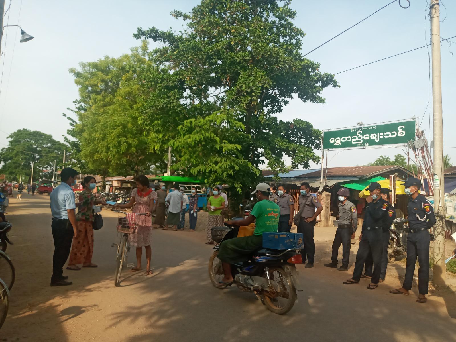 ထိုသို့ဆောင်ရွက်ရာတွင် မြို့နယ်အထွေထွေအုပ်ချုပ်ရေးဦးစီးဌာန၊ မြို့နယ်ရဲတပ်ဖွဲ့၊ မီးသတ်တပ်ဖွဲ့၊ မြို့နယ် စီမံကိန်းရေးဆွဲရေးဦးစီးဌာန၊ မြို့နယ်ဆည်မြောင်းနှင့် ရေအသုံးချမှုစီမံခန့်ခွဲရေးဦးစီးဌာနနှင့် ပြန်/ဆက်ဦးစီး ဌာနတို့ ပူးပေါင်း၍ ပြည်သူများ နေအိမ်ပြင်ပသို့ထွက်ခွာပါက နှာခေါင်းစည်းများ စနစ်တကျ တပ်ဆင်သွားလာရေး လူထုလှုပ်ရှားမှု အသွင်ဖြင့် နှာခေါင်းစည်းတပ်ဆင်ခြင်း မရှိသူများကို နှာခေါင်းစည်း(၄၀၀)ခုကို အခမဲ့ ဖြန့်ဝေ ပေးခဲ့ကြောင်း သိရသည်။