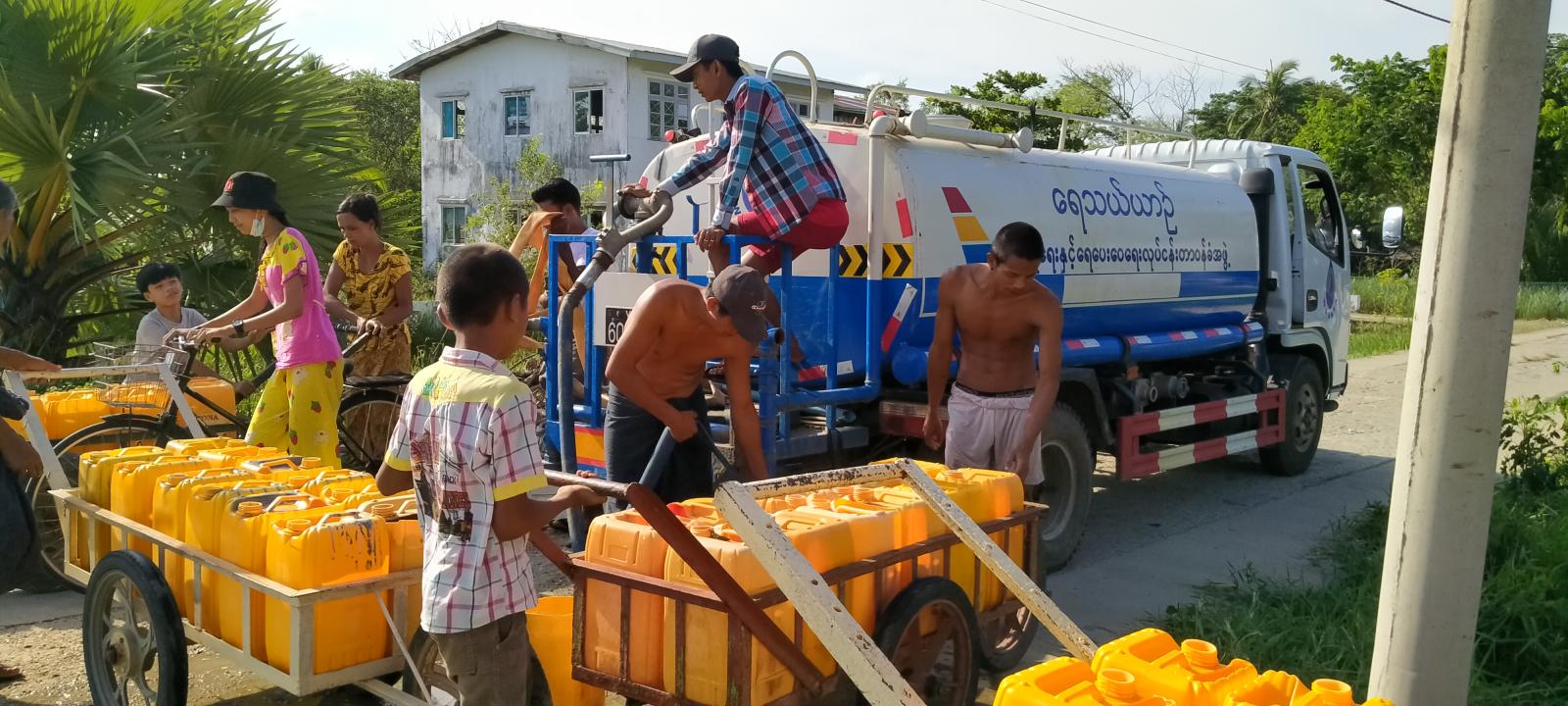 “ကျွန်တော်တို့ အဓိကဖြန့်ဝေပေးတာတော့ ကန်ရေကို တဆင့်ဖြန့်ဝေပေးတဲ့ ရပ်ကွက်အလိုက်မှာရှိတဲ့ အုတ်ကန် တွေနဲ့ အလှမ်းဝေးတဲ့ ပြည်သူတွေ သောက်သုံးရေရအောင် ရေဂါလံ ၁၂၀၀ဆံ့ ရေသယ်ယာဉ်(ကား)နဲ့ လိုက်လံ ဖြန့်ဝေပေးတာပါ” ဟု ရေသန့် ဌာနမှ တာဝန်ရှိသူတစ်ဦးက ပြောကြားသည်။