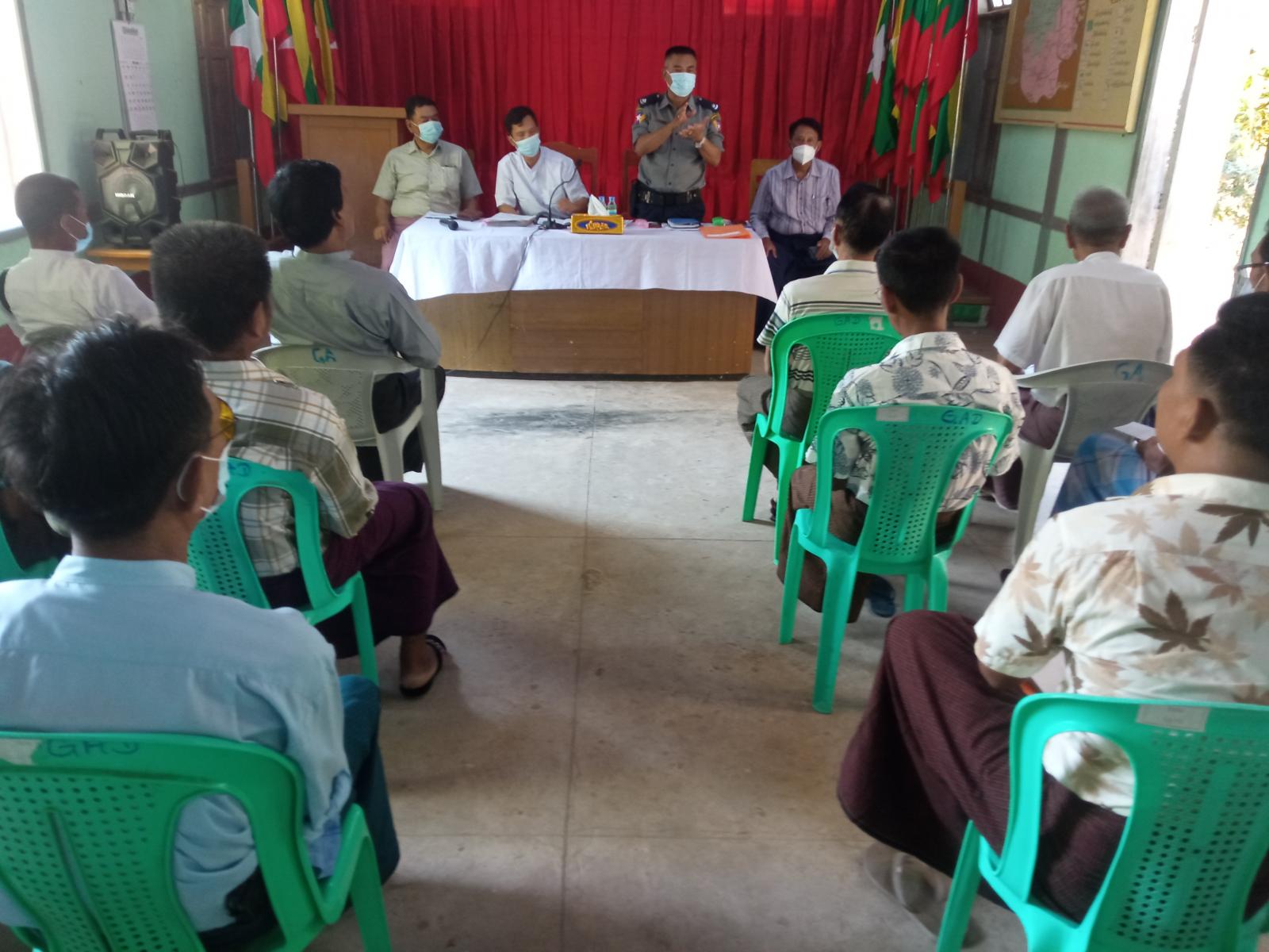 ထို့နောက်မြို့နယ် စီမံအုပ်ချုပ်ရေးအဖွဲ့ အဖွဲ့ဝင်မြို့နယ် လူဝင်မှုကြီးကြပ်ရေးနှင့် ပြည်သူ့အင်အားဆိုင်ရာ ဦးစီးဌာနမှူးရုံးမှ မြို့နယ်ဦးစီးမှူး ဦးတင်သန့်ဆွေက အိမ်ထောင်စုလူဦးရေစာရင်းနှင့် ဥပဒေနှင့်အညီ ကိုင်ဆောင်သင့်သည့် ကဒ်ပြားတစ်မျိုးမျိုး ဆောင်ရွက်ပေးမည့် ပန်းခင်းစီမံချက် ဆောင်ရွက် ပေးနေမှုများ၊ မြို့နယ်စီမံအုပ်ချုပ်ရေးအဖွဲ့ အဖွဲ့ဝင် အတွင်းရေးမှူး ရဲမှူးအေးနိုင်ဦးက ရပ်ကွက်၊ ကျေးရွာ တည်ငြိမ်အေးချမ်းရေး လုပ်ငန်းများ လုပ်ဆောင်ရာတွင် ပြတ်ပြတ်သားသား လုပ်ဆောင်သင့် ပါကြောင်း၊ မိမိတို့ ရပ်ကွက်၊ ကျေးရွာများအတွင်း ဆူပူအကြမ်းဖက်မှုနှင့် ပေါက်ကွဲမှုများ ဖြစ်ပွားလာပါက အချိန်မရွေး ဆက်သွယ် အကြောင်းကြားကာ ဝိုင်းဝန်းပူးပေါင်း ဆောင်ရွက် ပေးစေလိုကြောင်း ရှင်းလင်း ပြောကြားခဲ့ကြောင်း သိရသည်။