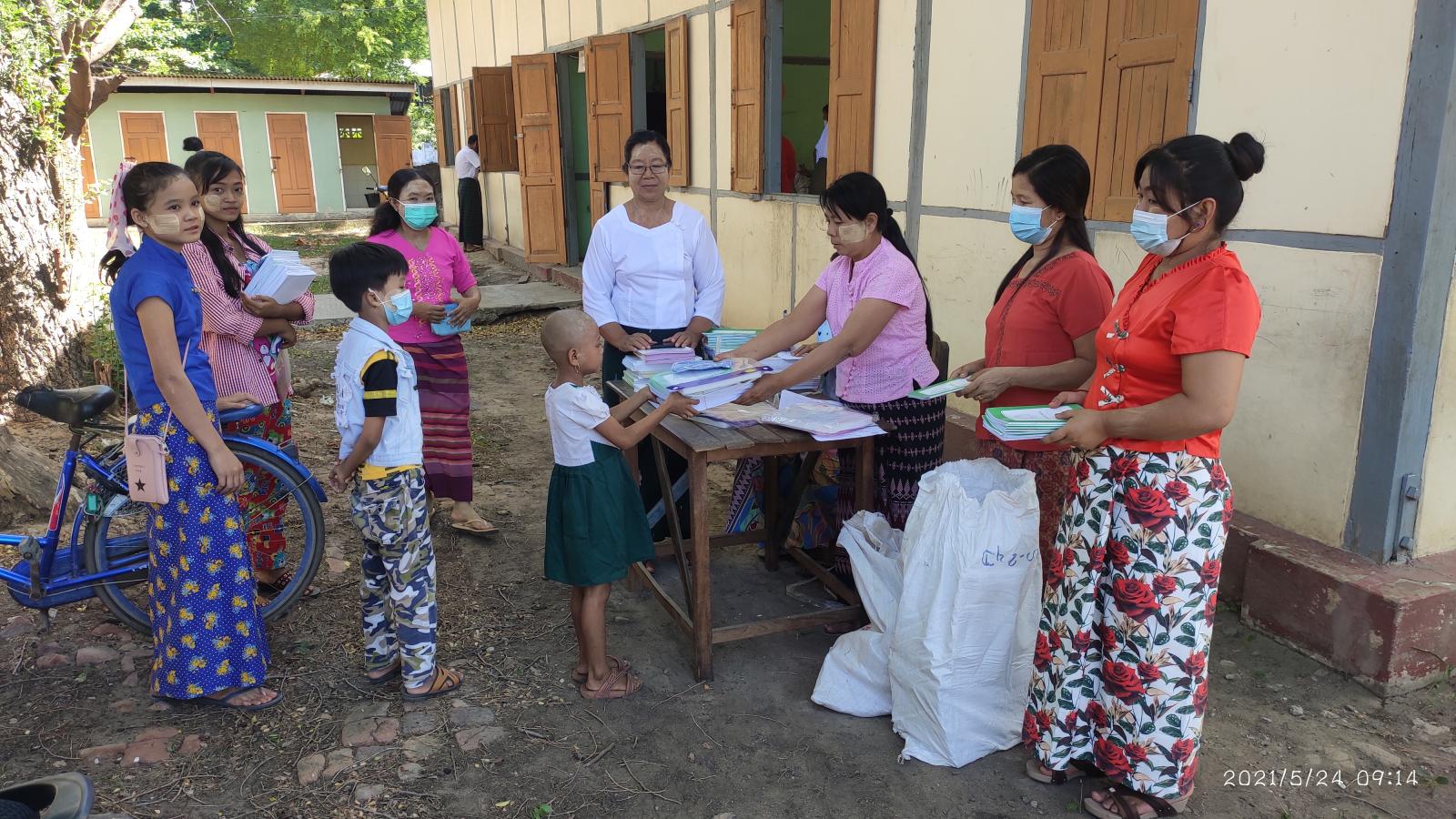 ယခုအခါ စာသင်ကျောင်းများ ဖွင့်လှစ်နိုင်ရေးအတွက် တာဝန်ကျ ကျောင်းအုပ်ကြီးများနှင့် ဆရာ၊ ဆရာများ က မိမိတို့တာဝန်ကျရာ ကျောင်းများ၌ ကျောင်းအပ်နှံရေး လုပ်ငန်းများကို အခမဲ့ ဆောင်ရွက်ခြင်း၊ နိုင်ငံတော်က ထောက်ပံ့ပေးအပ်သည့် ကျောင်းသုံးပြဌာန်းစာအုပ်၊ ဗလာစာအုပ်၊ ဘောပင်၊ ခဲတံ၊ mask face shiele တို့ကို အခမဲ့ပေးအပ် ခဲ့ကြသည်။