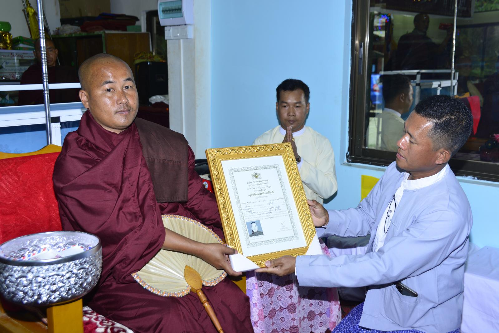ဆက်လက်၍ မြို့နယ်စီမံအုပ်ချုပ်ရေးအဖွဲ့၊ မြို့နယ်သာသနာရေးမှူးနှင့် ဌာနဆိုင်ရာ တာဝန်ရှိသူများ၊ မြို့နယ်ရပ်မိရပ်ဖများက ဆရာတော်၊ သံဃာတော်များအား လှူဖွယ်ပစ္စည်းများ လှူဒါန်းပြီး ဘွဲ့တံဆိပ်တော်ရ သံဃာတော်(၃)ပါးတို့အား ဘွဲ့တံဆိပ်တော်များ ဆက်ကပ် ပူဇော်ခဲ့ကြသည်။