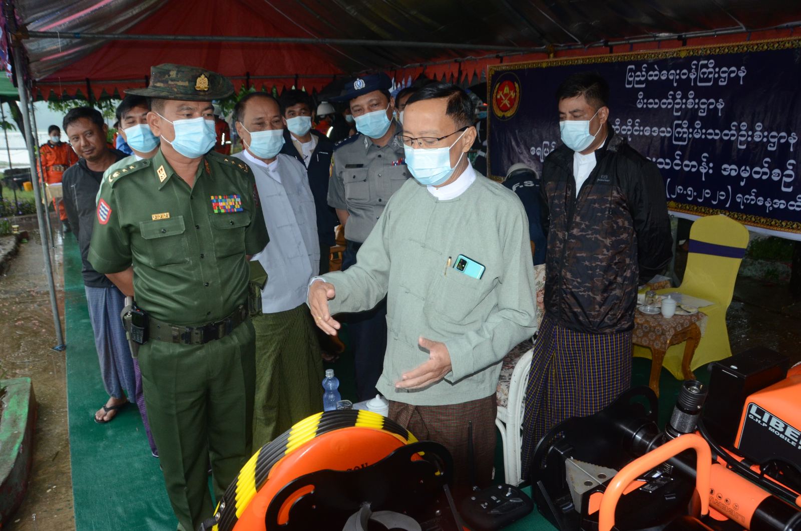 သရုပ်ပြပွဲအပြီးတွင် တိုင်းဒေသကြီးကောင်စီဥက္ကဋ္ဌနှင့် တာ၀န်ရှိသူများက ပြသထားသောရေပြင် ရှာဖွေကယ်ဆယ်ရာတွင် အသုံးပြုသည့် စက်ပစ္စည်းများကို ကြည်ရှုအားပေးခဲ့ကြသည်။