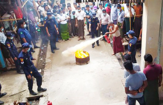 ထိုသို့ ဆောင်ရွက်ရာတွင် မြို့နယ်မီးသတ်ဦးစီးဌာနမှ မြို့နယ်မီးသတ်ဦးစီးမှူး ဦးစီးအရာရှိ ထွန်းရွှေ ခိုင်က မီးလောင်မှု ဖြစ်ပွားပါက ရှေးဦးစွာမီးငြိမ်းသတ်ဆေးဘူးဖြင့် စနစ်တကျဖြင့် မီးငြိမ်းသတ်မှု များကို ရှင်းလင်းပြောကြားပြီး မီးလောင်မှုဖြစ်ပွားနေစဉ် မီးသတ်ဆေးဘူးဖြင့် မီးငြိမ်းသတ် တတ်စေရန် ဈေးသူ၊ ဈေးသားများအား လက်တွေ့ သရုပ်ပြသစေကာ အပေါ့စား ရေစုပ်စက်ဖြင့် မီးငြိမ်းသတ်ရေးတို့ ကို ဇာတ်တိုက်လေ့ကျင့်ဆောင်ရွက်ခဲ့ကြသည်။