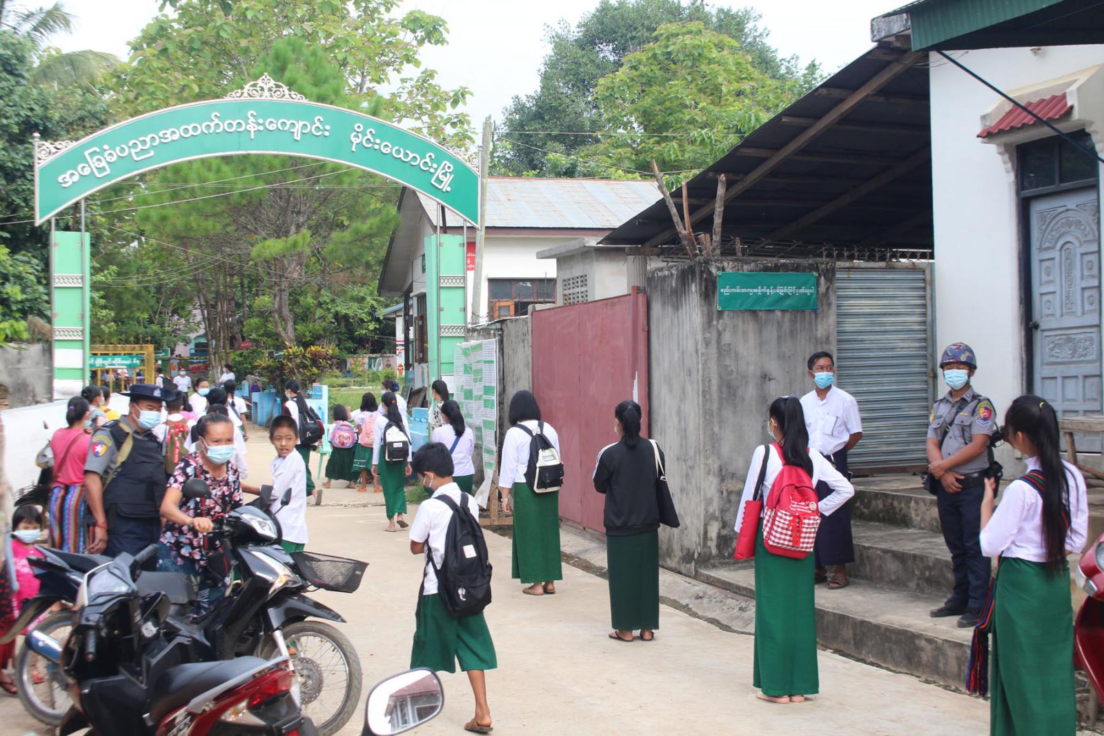 ကျောင်းများစတင်ဖွင့်လှစ်ရာတွင် ကိုဗစ်-၁၉ ရောဂါကာကွယ်ရေး စည်းကမ်းချက်များ အတိုင်း ဆရာ/မများက ကျောင်းဝင်ပေါက်ဝတွင် အပူချိန်တိုင်းခြင်း၊ နှာခေါင်းစည်း (Mask)နှင့် Face Shield များတပ်ဆင်စေခြင်း၊ လက်ဆေးစေခြင်းများ ပြုလုပ်ပြီးနောက် ကျောင်းသို့ စနစ်တကျ တန်းစီပြီး အတန်းလိုက်ဝင်ရောက်စေကာ၊ စာသင်ခန်းတွင်း၌လည်း တစ်ဦးနှင့်တစ်ဦး သတ်မှတ်အကွာအဝေးဖြင့် ထိုင်ရသဖြင့် ကျောင်းသားဦးရေအလိုက် မနက်ပိုင်းနှင့် ညနေပိုင်းဖြင့် စာသင်ချိန်အခန်းများခွဲ၍ သတ်မှတ်ဖွင့်လှစ်သင်ကြားပေလျက်ရှိကြောင်း သိရသည်။