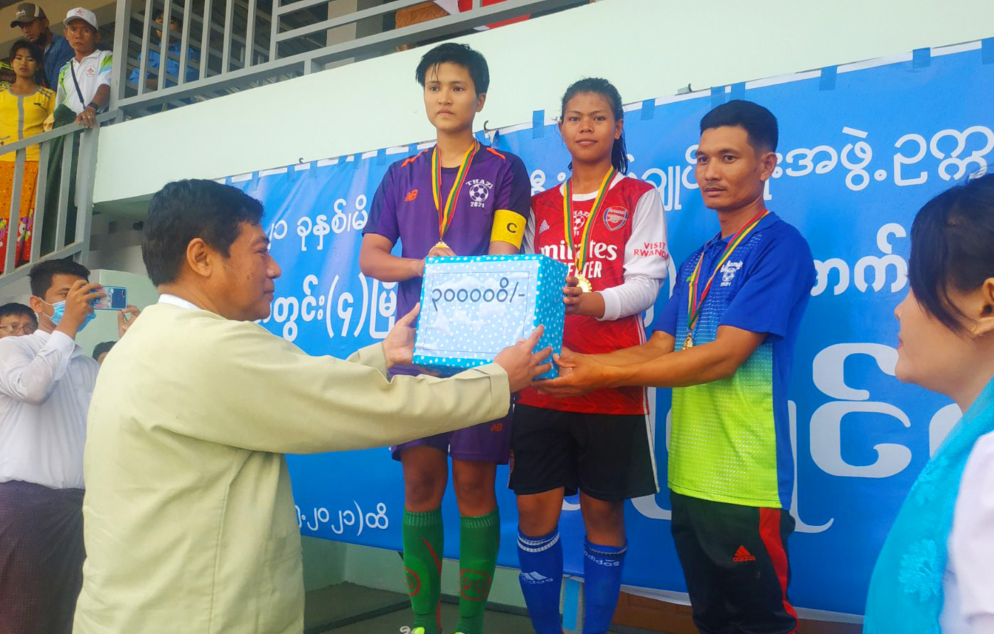 ၎င်းနောက် ဆုချီးမြှင့်ပွဲ ဆက်လက်ကျင်းပရာ ပထမဆုရရှိသည့်သာစည်မြို့နယ် အသင်းအား ဆုကလပ်နှင့် ငွေသားဆုများ၊ တစ်ဦးချင်းဆုတံဆိပ်များအား လည်းကောင်း၊ ဒုတိယဆုရရှိသည့် မိတ္ထီလာမြို့နယ်အသင်းအား တစ်ဦးချင်းဆုတံဆိပ်များနှင့် ငွေသားဆုများအားလည်းကောင်း၊ အဆိုပါ အသင်းနှစ်သင်းမှ နေရာလိုက်အကောင်းဆုံး အားကစားဆုရရှိသူများနှင့် ပွဲစဉ်တစ်လျှောက်အကောင်းဆုံးကစားသမားဆုရရှိသူအားလည်းကောင်း ဒုတိယခရိုင်ချုပ်ရေးမှူးဦးကျော်စွာထွန်း၊ မိတ္ထီလာမြို့နယ် အုပ်ချုပ်ရေးမှူး ဦးဇော်အောင်လေး၊ ခရိုင်စီမံအုပ်ချုပ်ရေး အဖွဲ့ဝင် ဦးကျော်ဇေယျ၊ မြို့နယ်စီမံအုပ်ချုပ်ရေး အဖွဲ့ဝင် ဦးတင့်ဆန်း ၊ ခရိုင်အားကစားနှင့် ကာယပညာဦးစီးဌာန ခရိုင်ဦးစီးမှူး ဒေါ်မြင့်မြင့်ထွေး နှင့်တာဝန်ရှိသူများက ပေးအပ်ချီးမြှင့်ခဲ့ကြောင်း သိရသည်။