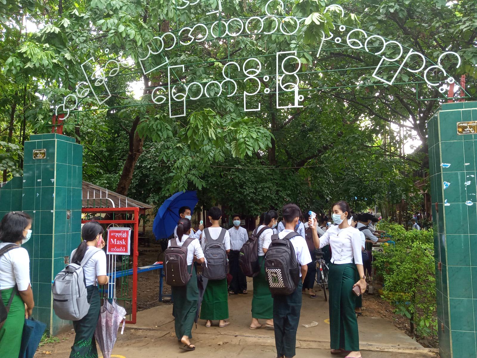 အဆိုပါ အခြေခံပညာကျောင်းများဖွင့်လှစ်ပြီး ကျန်းမာရေးနှင့်အားကစားဝန်ကြီးဌာန၏ ကိုဗစ်-၁၉ ရောဂါ ကာကွယ်ရေး ဆိုင်ရာလမ်းညွှန်ချက်၊ ထုတ်ပြန်ချက်များနှင့်အညီ ကျောင်းသား၊ ကျောင်းသူ များကို ကျောင်းဝင်း အတွင်းသို့မဝင်ရောက်မီ ကိုယ်အပူချိန် တိုင်းတာပေးခြင်း၊ ဆပ်ပြာ (သို့မဟုတ်) လက်သန့်ဆေးရည်ဖြင့် စနစ်တကျလက်ဆေးစေခြင်း၊ တစ်ဦးနှင့်တစ်ဦး သတ် မှတ်အကွာ အဝေးနေရာများစီစဉ်ထားရှိခြင်း၊ နှာခေါင်း စည်း (Mask)များနှင့် မျက်နှာဖုံးအကာ (Face Sheild) များတပ်ဆင်စေပြီးမှ ဆရာ၊ ဆရာမများမှ သင်ခန်းစာ ဘာသာရပ်များအားသင် ကြားပို့ချပြသပေးခြင်း အစရှိသည့် ရောဂါကြိုတင်ကာကွယ်ရေးနည်းလမ်းများဖြင့် အခြေခံပညာ အထက်တန်း၊ အလယ်တန်းနှင့်မူလတန်းကျောင်းများ သင်ကြားပြသနေမှုအခြေအနေများအား ခရိုင်စီမံအုပ်ချုပ်ရေးအဖွဲ့ဥက္ကဋ္ဌနှင့်အဖွဲ့ဝင်များမှ သွားရောက်ကြည့်ရှုခဲ့ကြောင်းသိရှိရသည်။