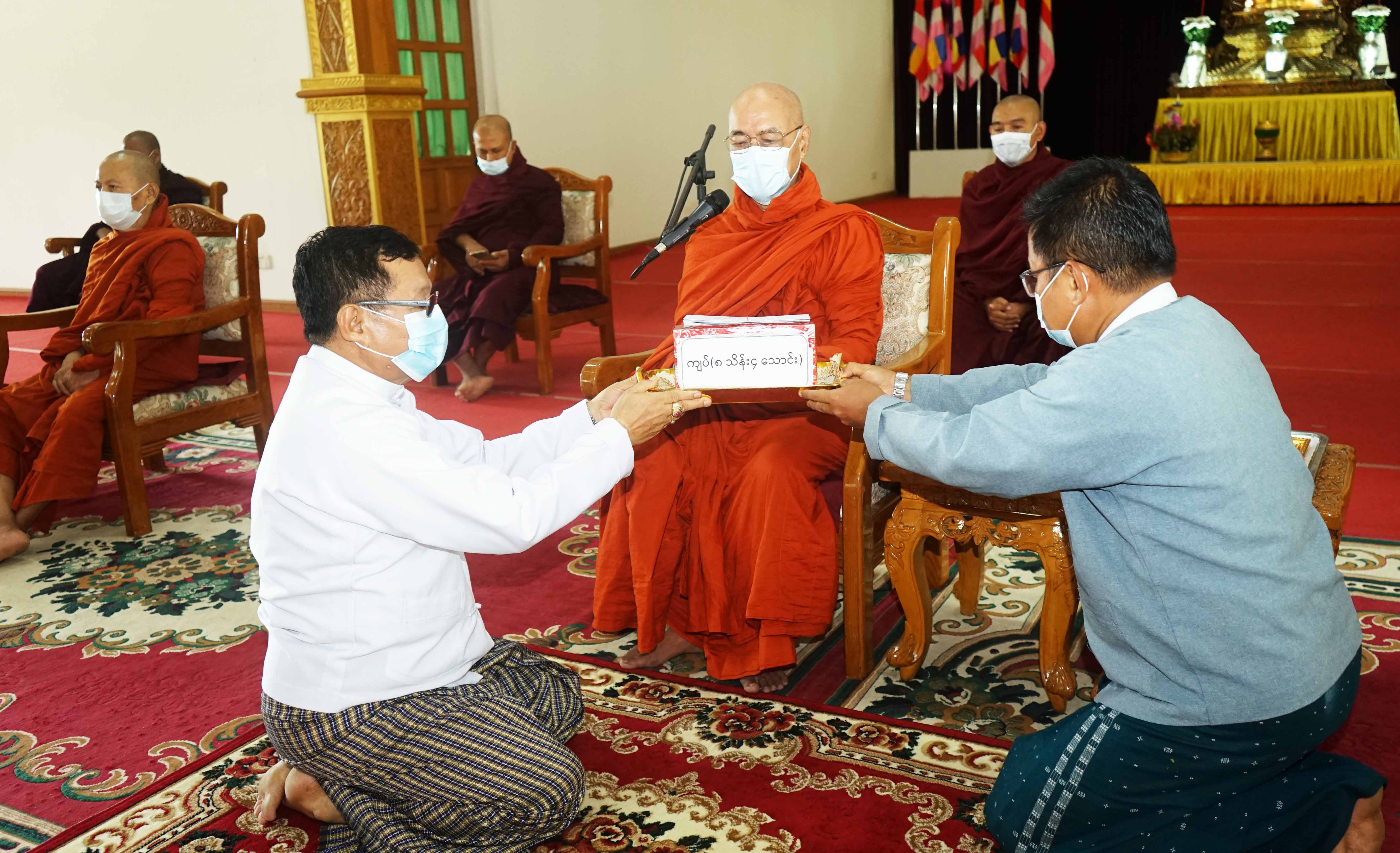ထို့နောက် နေပြည်တော်တိုင်းသံဃနာယကအဖွဲ့ အကျိုးတော်ဆောင် ပျဉ်းမနားမြို့၊ မဟာလယ်တီစံ ကျောင်းတိုက်၊ ပဓာနနာယကဆရာတော် အဂ္ဂမဟာသဒမ္မ ဇောတိကဓဇ၊ အဂ္ဂမဟာ ကမ္မဌာနာစရိယ၊ ဘဒ္ဒန္တဣန္ဒာဝုဓ မဟာထေရ်မြတ်က လှူဒါန်းမှုအစုစုတို့အတွက် ဂုဏ်ပြုမှတ်တမ်းလွှာနှင့် ရေစက်သွန်းချ အမျှပေးတရားတော် ချီးမြှင့်ပေးတော်မူခဲ့ကြောင်း သိရသည်။