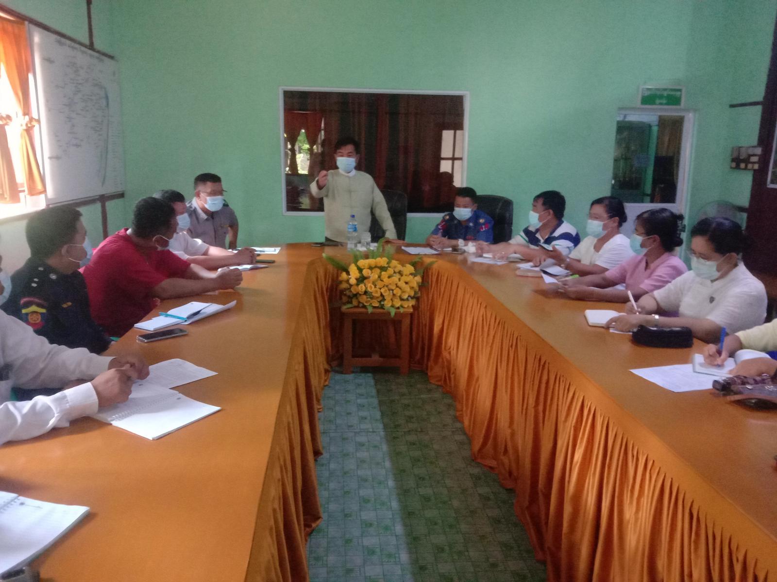 အစည်းအဝေးတွင် ကိုဗစ်-၁၉ ထိန်းချုပ်ရေးနှင့် အရေးပေါ် တုံ့ပြန်ရေးကော်မတီ ဥက္ကဌ ဦးသိန်းစိုးက ကိုဗစ်-၁၉ ထိန်းချုပ် ရေးနှင့်အရေးပေါ် တုန့်ပြန် ရေးကော်မတီကိုပြန်လည်ဖွဲ့စည်းတာ၀န် ပေးအပ်ပြီးဖြစ်ပါကြောင်း၊ကိုဗစ်-၁၉ ရောဂါထိန်းချုပ် ကုသရေးလုပ်ငန်းများကို လမ်းညွှန် ချက်များ နှင့် အညီညွှန်ကြားချက်များအတိုင်း ဌာန ဆိုင်ရာ များအနေဖြင့်ပူးပေါင်းဆောင်ရွက်သွားကြရန် လိုအပ်ကြောင်း၊Quarantline Center) အဖြစ် မဟာ စည် သာသနာ့ ရိပ်သာနှင့် မိုးကုတ်ဝိပဿနာရိပ်သာတို့ကို ရွေးချယ်ထားပါကြောင်း ၊ ကိုဗစ်-ရောဂါ ထိန်းချုပ်ရေး လုပ်ငန်း များတွင် Volunteerများပူး ပေါင်းပါ၀င်လာစေလိုပါကြောင်းနှင့်တက်ရောက် လာကြသည့် ဌာနဆိုင်ရာ တာဝန်ရှိ သူများက ကိုဗစ်-၁၉ရောဂါထိန်းချုပ် လုပ်ငန်းများတွင်လည်းပူး ပေါင်းပါ၀င်သွားစေလိုပါကြောင်း ပြောကြား ခဲ့သည်။