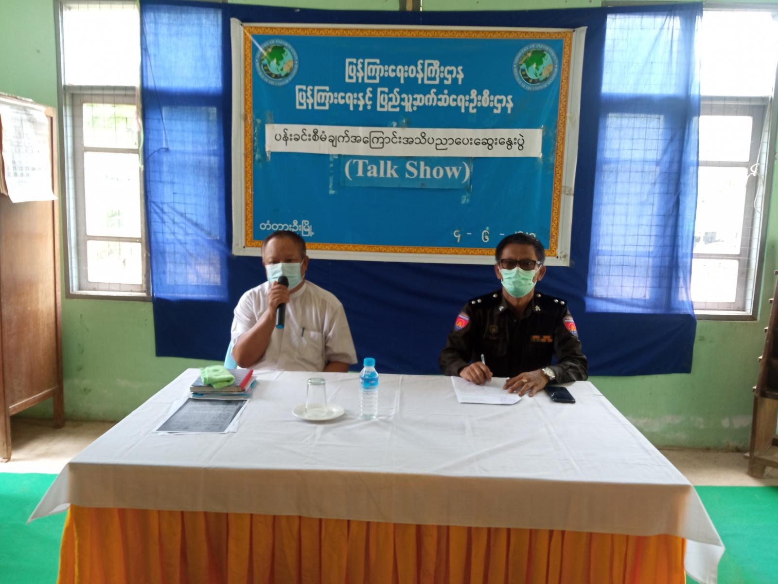 ရှေးဦးစွာ မြို့နယ်ပြန်ကြားရေးနှင့်ပြည်သူ့ဆက်ဆံရေးဦးစီးဌာန မြို့နယ်ဦးစီးမှူး ဦးဘိုမောင်က လူတိုင်းလူတိုင်း အရွယ်ရောက်လာလျှင် နိုင်ငံသားစိစစ်ရေးကတ်ပြားပြုလုပ်သင့်ပါကြောင်း ၊ ပြုလုပ်ရန် လည်း လိုအပ်ပါကြောင်း နိုင်ငံသားစိစစ်ရေးကတ်ပြားသည် လူတိုင်းအတွက် အရေးကြီးပါကြောင်းနှင့် ဆွေးနွေးပွဲ ( Talk Show ) ကျင်းပရခြင်း၏ ရည်ရွယ်ချက်များကို ရှင်းလင်းပြောကြားသည် ။