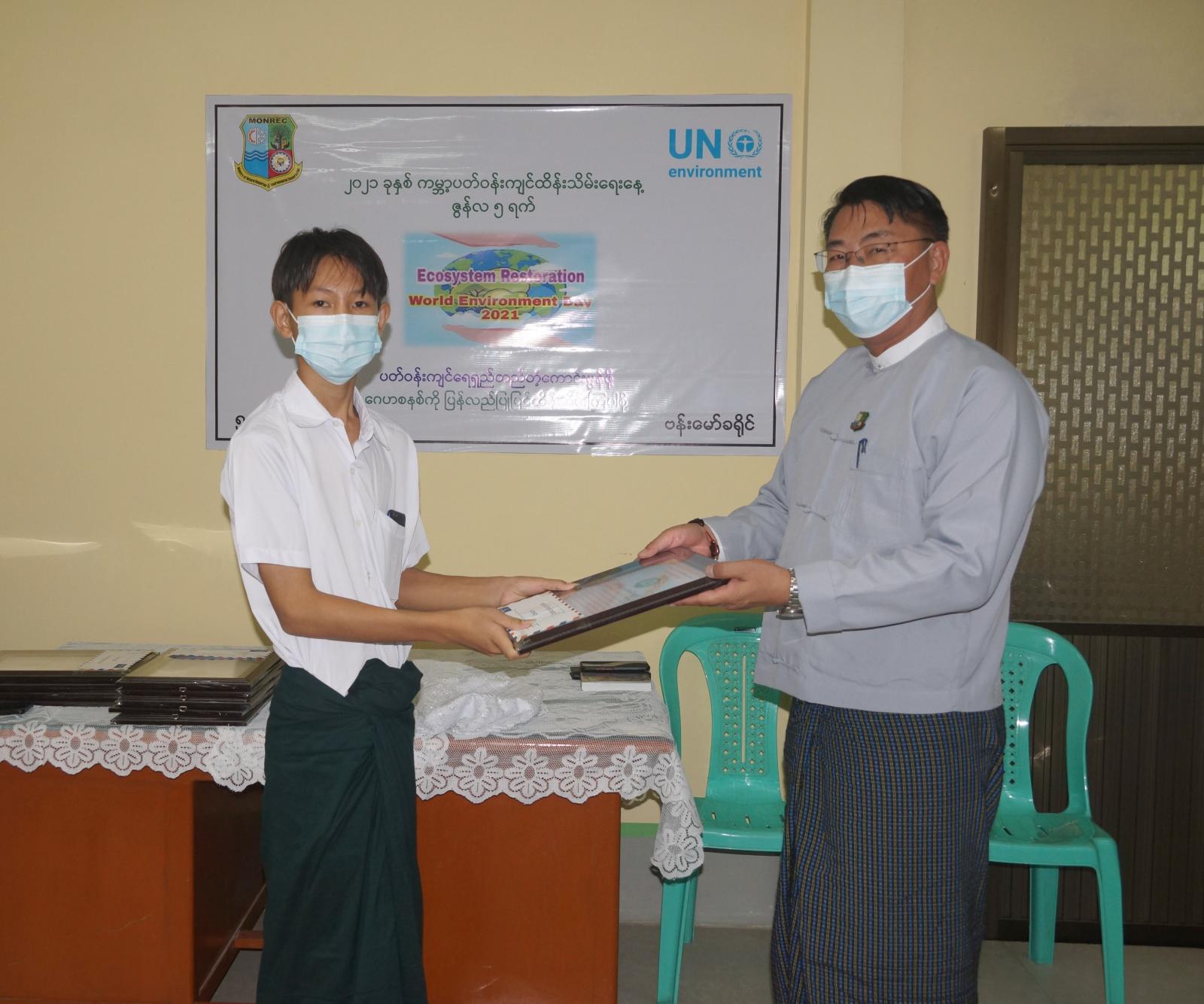 ဆက်လက်၍ ပန်းချီပြိုင်ပွဲတွင် ၂၀၂၁ ခုနှစ် ကမ္ဘာ့ပတ်ဝန်းကျင် ထိန်းသိမ်းရေးနေ့ အထိမ်းအမှတ် ဆောင်ပုဒ်ဖြစ်သည့် "Ecosystem Restoration" ပတ်ဝန်းကျင် ရေရှည်တည်တံ့ ကောင်းမွန်ဖို့ ဂေဟစနစ်ကို ပြန်လည် ထိန်းသိမ်းကြပါစို့" ခေါင်းစဉ်ဖြင့် ပါဝင်ယှဉ်ပြိုင်ခဲ့သော ဆုရ ကျောင်းသား ကျောင်းသူများအား လက်ထောက် ညွှန်ကြားရေးမှူး ဦးညီညီဇော်နှင့် ရွှေကူမြို့နယ် ပတ်ဝန်းကျင် ထိန်းသိမ်းရေး ဦးစီးဌာန မြို့နယ်ဦးစီးမှူး ဒေါ်မို့မို့ချစ်တို့က ဆုများအသီးသီး ပေးအပ်ခဲ့ကြောင်း သိရသည်။