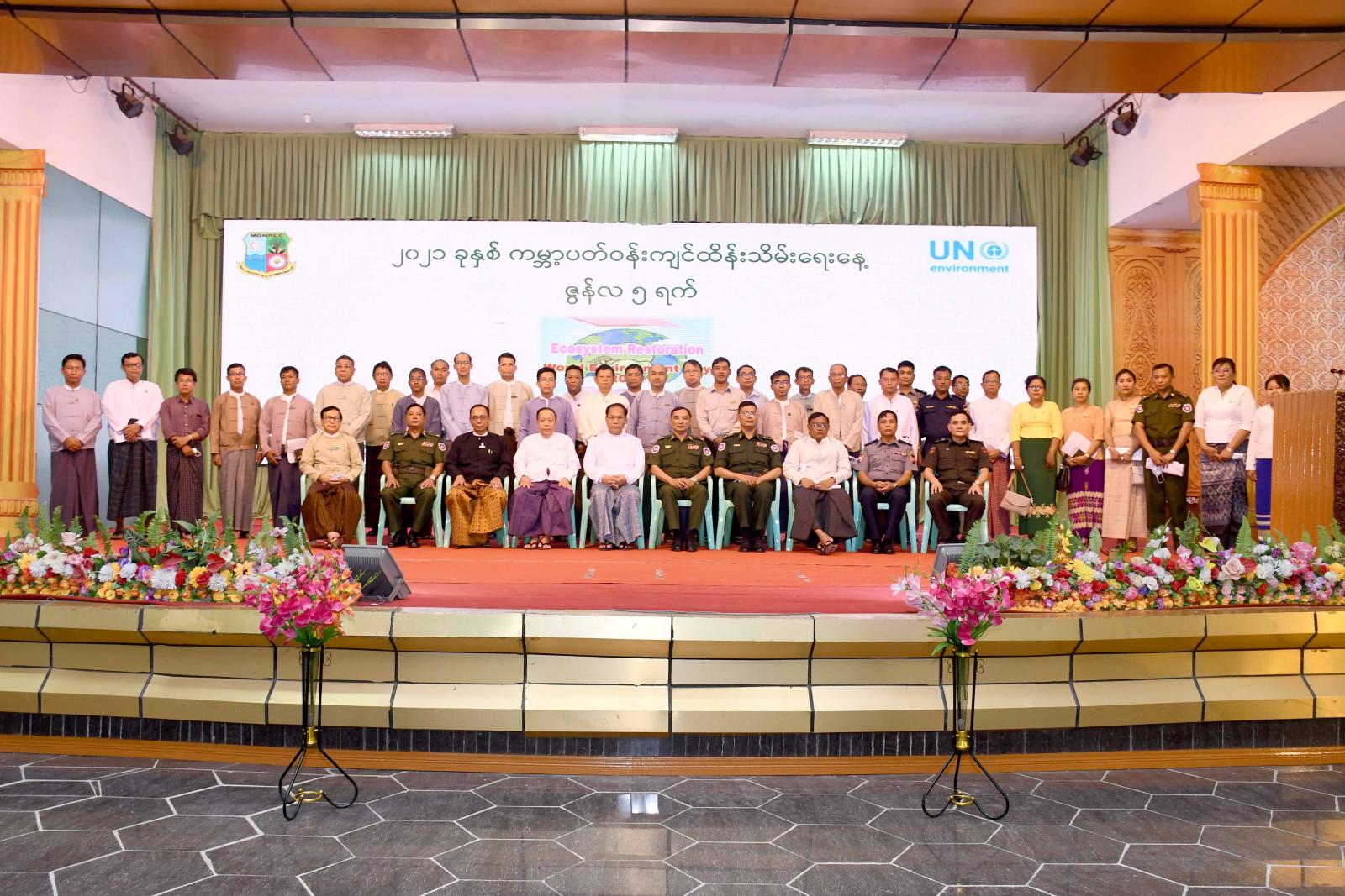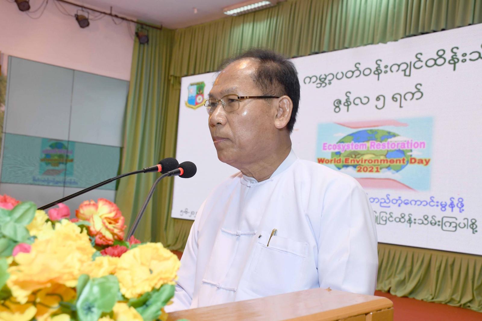အခမ်းအနားတွင် ရခိုင်ပြည်နယ်စီမံအုပ်ချုပ်ရေးကောင်စီဥက္ကဌ၊ ဒေါက်တာ အောင်ကျော်မင်းက ၂၀၂၁ ခုနှစ် ကမ္ဘာ့ပတ်ဝန်းကျင်ထိန်းသိမ်းရေးနေ့မှစ၍ လူပုဂ္ဂိုလ်တစ်ဦးချင်း၊ အစုအဖွဲ့များ၊ အစိုးရများ၊ စီးပွားရေးလုပ်ငန်း များနှင့် အဖွဲ့အစည်းများအားလုံးအနေဖြင့် ဂေဟစနစ်ပျက်စီးမှုကိုတားဆီးရန်၊ ရပ်တန့်ရန်နှင့် ဖယ်ရှားနိုင်ရန် အတွက် ကမ္ဘာလုံးဆိုင်ရာ လှုပ်ရှားမှုတစ်ခုတွင် ပါဝင်ဆောင်ရွက်ကြပြီး အားလုံးအတွက် ရေရှည်တည်တံ့သည့် အနာဂတ်ကို ရယူနိုင်အောင် ပူးပေါင်းဆောင်ရွက်သွားကြရမည်ဖြစ်ကြောင်း၊ လာမည့် ၂၀၃၀ ပြည့်နှစ်တွင် ရာသီဥတုပြောင်းလဲမှုကို ကာကွယ်နိုင်ရန်အတွက် မှန်လုံအိမ်ဓာတ်ငွေ့ထုတ်လုပ်မှုများကို ထက်ဝက်လျှော့ချရ မည်ဖြစ်ကြောင်း၊ ဆင်းရဲနွမ်းပါးမှုကို ပပျောက်စေခြင်းနှင့် ဇီဝမျိုးစုံမျိုးကွဲများကို ကာကွယ်ပေးရန် ကူးစက် ရောဂါများကို တိုက်ဖျက်ခြင်းဖြင့် ရေရှည်ဖွံ့ဖြိုးတိုးတက်မှုပန်းတိုင်သို့ ရရှိရန်အတွက် ကြီးမားသော ပြောင်းလဲ တိုးတက်မှုများ လိုအပ်လျက်ရှိပါကြောင်း၊ ဂေဟစနစ်ကို ပြန်လည်ထူထောင်ခြင်းသည် အရေးကြီးသော စိန်ခေါ်မှု တစ်ခုပင် ဖြစ်ပါကြောင်း၊ မိမိတို့အနေဖြင့် သဘာဝတရားအပေါ် ပြုမူဆောင်ရွက်မှုနည်းလမ်းများကို ပြောင်းလဲခြင်းဖြင့်လည်းကောင်း၊ ဂေဟစနစ်အပေါ်သက်ရောက်နေသော ဖိအားများကို လျော့နည်းသက်သာ ရာရစေမည့် နည်းလမ်းများကိုလည်းကောင်း ဆောင်ရွက်ကြရမည်ဖြစ်ကြောင်း၊ လူသားများအနေဖြင့် ဂေဟ စနစ်ကို ကာကွယ်ထိန်းသိမ်းနိင်ရန် အားနည်းခြင်းနှင့် လက်ရှိအတိုင်းအလွန်းအကျွံ အသုံးချနေခြင်းကို မပြောင်းလဲနိုင်ပါက မိမိတို့မြတ်နိုးရှင်သန်ရာ ကမ္ဘာမြေကြီးကို ဆုတ်ယုတ်ပျက်စီးအောင် လုပ်ဆောင်နေသကဲ့ သို့ဖြစ်နေပါကြောင်း၊ ထို့အပြင် အနာဂတ်မျိုးဆက်သစ်များထံသို့လည်း ကောင်းမွန်၍ နေထိုင်ချင်စရာ ကမ္ဘာမြေကို လက်ဆင့်ကမ်းအမွေပေးနိုင်ရန်အတွက် ခက်ခဲသွားမည်မှာ အမှန်ပင်ဖြစ်ကြောင်း၊ ထို့ကြောင့် အခမ်းအနားသို့တက်ရောက်လာသူများနှင့် ပြည်သူ၊ ပြည်သားများအနေဖြင့် ပတ်ဝန်းကျင်ထိန်းသိမ်းရေးကို ထိခိုက်ပျက်စီးစေနိုင်မည့် မိမိတို့၏ နေ့စဉ်ပြုမူ နေထိုင်မှုပုံစံများကို ပြုပြင်ပြောင်းလဲပြီး ပစ္စုပန်အကျိုးနှင့် အနာဂတ်အကျိုး ရေရှည်စဉ်ဆက်မပြတ် ဖွံ့ဖြိုးတိုးတက်ရေးအတွက် ဝိုင်းဝန်းပူးပေါင်းဆောင်ရွက်သွားရမည် ဖြစ်ကြောင်းပြောကြားသည်။ ထို့နောက် ကမ္ဘာ့ကုလသမဂ္ဂအထွေထွေအတွင်းရေးမှူးချုပ် Antonio Guterres ထံမှ ပေးပို့သည့် ကမ္ဘာ့ပတ်ဝန်းကျင်ထိန်းသိမ်းရေးနေ့ဆိုင်ရာ သဝဏ်လွှာမှတ်တမ်းဗီဒီယိုမှတ်တမ်း၊ ကမ္ဘာ့ကုလသမဂ္ဂ ပတ်ဝန်းကျင်အစီအစဉ်၏ အမှုဆောင်ဒါရိုက်တာ Ms. Inger Andersen ၏ အမှာစကား မှတ်တမ်း ဗ