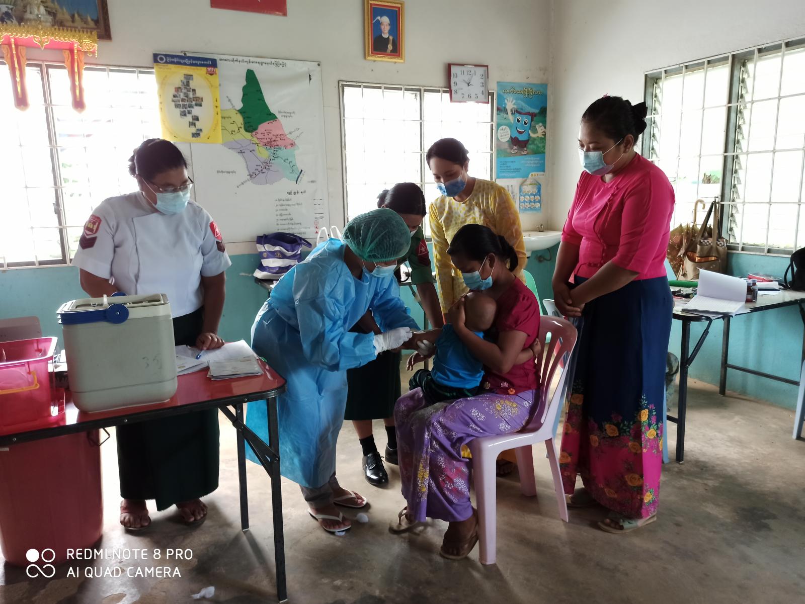“ကလေးငယ်များအား ကာကွယ်ဆေးထိုးနှံရန် လာရောက်ကြသည့် ကလေးမိခင်များကို ကျန်းမာရေးဝန်ကြီးဌာန၏ ကိုဗစ်-၁၉ ရောဂါကြိုတင်ကာကွယ်ရေး ညွှန်ကြားချက်များနှင့် အညီ နှာခေါင်းစည်း(Mask) ကိုစနစ်တကျ တပ်ဆင်စေပြီး ကလေးငယ်များကိုကာကွယ် ဆေးထိုးခြင်း၊ပိုလီယိုကာကွယ်ဆေးထိုးခြင်း၊အစက်ချကာကွယ်ဆေး တိုက်ကျွေးခြင်းများကို
