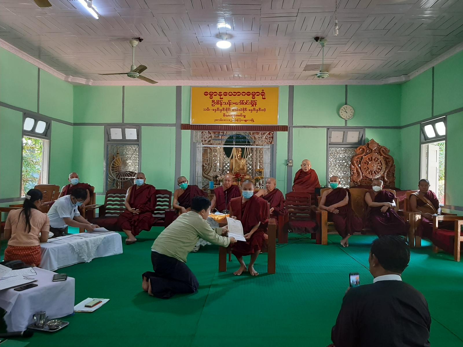 ဆက်လက်ပြီး မြို့နယ်စီမံအုပ်ချုပ်ရေးအဖွဲ့က္ကဌနှင့်အဖွဲ့ဝင်များ၊အလှူရှင်များက ၂၀၂၀ ပြည့် နှစ် အစိုးရပါဠိ ပထမပြန်စာမေးပွဲအောင်မြင်ခဲ့သည့် ပထမကြီးတန်း(၆)ပါး၊ ပထမလတ် တန်း (၃)ပါး၊ ပထမငယ်တန်း(၄)ပါး၊ အခြေပြုမူလတန်း(၃)ပါး၊ စုစုပေါင်းစာအောင်သံဃာ (၁၆)ပါးအား ဂုဏ်ပြုအလှူတော်ငွေကျပ် (၃) သိန်း(၈)သောင်းနှင့်အောင်လက်မှတ် များကို ဆက်ကပ်လှူဒါန်းခဲ့ပြီး မြို့နယ်သံဃနာယကအဖွဲ့ဥက္ကဌ (ရွှေကျင်)ဆရာတော်မဟာ သဒ္ဓမ္မဇောတိကဓဇ ဥုးပညာဇောတ ထံမှရေစက်သွန်းချ အနုမောဒနာတရားနာယူကာ အခမ်းအနားကို ဗုဒ္ဓသာသနံစိရံတိဌတု သုံးကြိမ်ရွတ်ဆိုရုတ်သိမ်းခဲ့သည်။