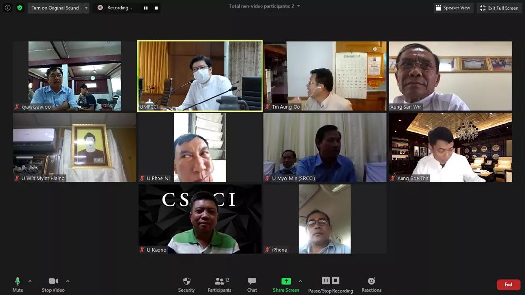 လမ်းမတော်မြို့နယ် UMFCCI တွင် ပြည်နယ်/တိုင်းများတွင် ကိုဗစ်-၁၉ ချေးငွေလျှောက်လွှာ လက်ခံ ရရှိမှုအခြေအနေ၊ ယမန်နေ့ နံနက်ပိုင်းအထိ လျှောက်လွှာလက်ခံရရှိသည့် အရေအတွက်နှင့် လျှောက်လွှာအများဆုံးရရှိသည့် လုပ်ငန်းကဏ္ဍ များ၊ လက်ခံရရှိသည့် လျှောက်လွှာများအား စုစည်း၍ ကုန်သည် စက်မှုအသင်းချုပ်ရုံးသို့ အလျင်မြန်ဆုံး ပေးပို့နိုင်ရေး တို့နှင့် စပ်လျဉ်း၍ အသင်းချုပ် အထွေထွေအတွင်း ရေးမှူးချုပ် ဦးအေးဝင်းနှင့် ပြည်နယ်/တိုင်း CCI များနှင့် ယနေ့ မွန်းလွဲပိုင်းတွင် ဆွေးနွေးခဲ့ကြသည်။