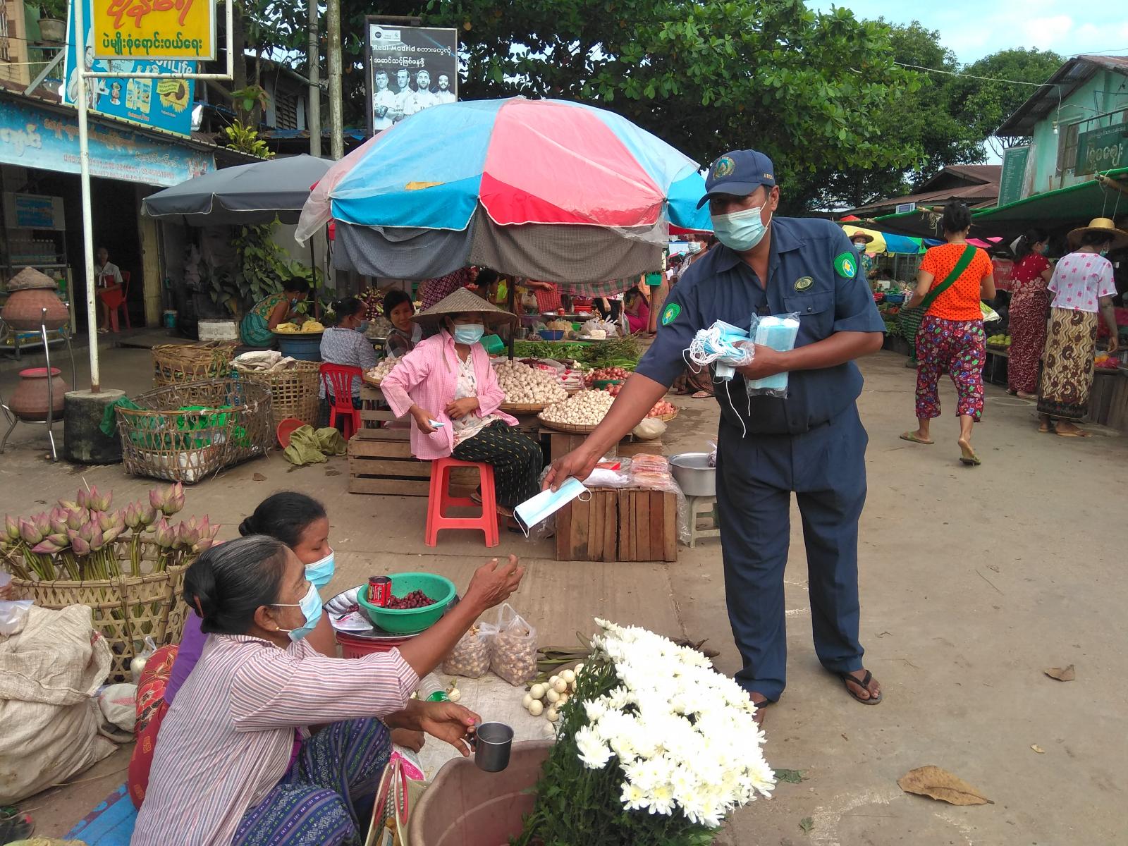 အဆိုပါ ဖြန့်ဝေမှုတွင် မြို့နယ်အုပ်ချုပ်ရေးမှူး၊ မြို့နယ်ကျန်းမာရေး အထောက်အကူပြု ကော်မတီဝင်များ၊ မြို့နယ်စည်ပင်သာယာရေး ကော်မတီဥက္ကဋ္ဌနှင့် အဖွဲ့ဝင်များ၊ မြို့မဈေးကော်မတီဝင်များက နှာခေါင်းစည်း mask (၁၅၀၀) ကို ဈေးဝယ် ဈေးသည်များအား ဖြန့်ဝေ ပေးခဲ့ကြောင်း သိရသည်။