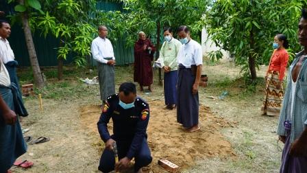 ရှေးဦးစွာ မင်းကျောင်းပရိယတ္တိစာသင်တိုက်ပဓာန နာယက အဘိဓဇအဂ္ဂ မဟာသဒ္ဓမ္မဇောတိက ဆရာတော် ဘဒ္ဒန္တဝေဠုရိယ၊ အမျိုးသားလွှတ်တော်ကိုယ်စားလှယ် ဒေါ်အုန်းကြည်၊ မြို့နယ်အုပ်ချုပ်ရေးမှူး ဦးအောင်မိုးနှင့် မီးသတ်ဦးစီးမှူး ဦးထွန်းထွန်းလင်းတို့က မီးသတ်မျှော်စင်တည်ဆောက်မည့်မြေနေရာအား ပန္နက်တင်မင်္ဂလာ ပြုလုပ်ပေးခဲ့ကြသည်။